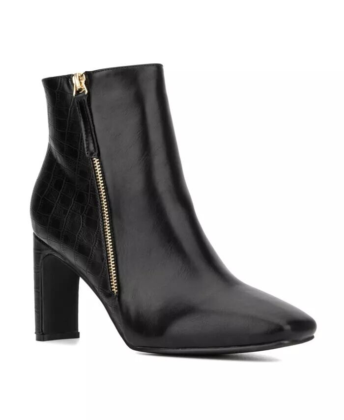 Ботильоны Una имеют верх с двойной фактурой, квадратный носок, удобный высокий каблук и застежку-молнию сбоку.