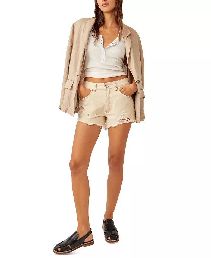 Джинсовые шорты Now or Never от Free People выглядят поношенными, с большим количеством рваных и потертых деталей.