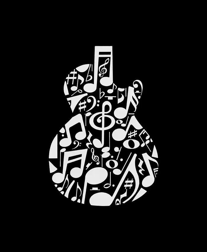 Ноты - это универсальный язык человечества. Поставьте людей в комнату, где люди говорят на разных языках, и они смогут начать играть одну и ту же музыку вместе, не говоря ни слова. Этот дизайн в стиле словесного искусства прославляет красоту музыки, создавая корпус гитары из стильных музыкальных нот.