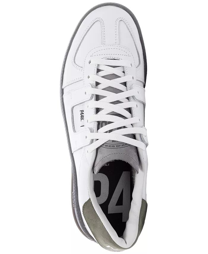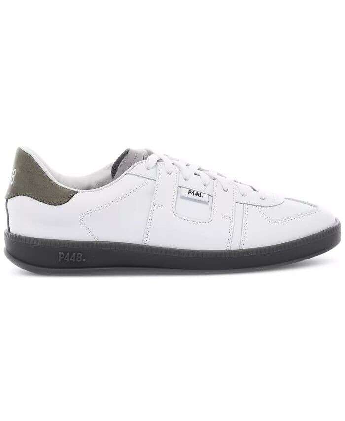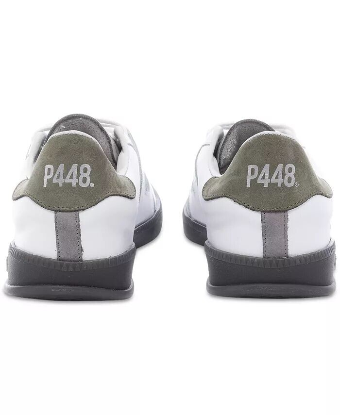 Низкие кроссовки MONZA на шнуровке от P448. Изготовленные из белой кожи и замши, эти туфли имеют зеленую замшевую вставку на пятке, дополненную светло-серо-жемчужным язычком и белыми хлопковыми шнурками. Идеальное сочетание элегантности и комфорта, эти нейтральные туфли - must-have для любого модника.