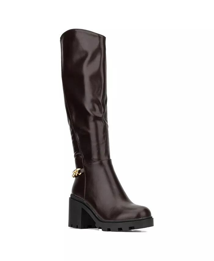 Ботинок Athena имеет подошву на платформе и толстый каблук. Он тщательно украшен металлической цепочкой, круглым носком и застежкой-молнией сбоку.