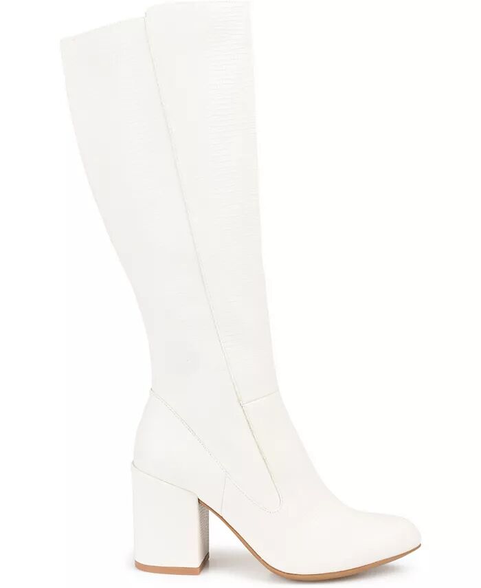 Ботинки, которые делают образ. Ботинки Tavia от Journee Collection имеют верх из искусственной кожи с текстурой под ящерицу, который доходит до колен, и дополнен внутренней молнией. Стелька из пены Tru Comfort толщиной 4 мм делает их удобными для стояния, а блочный каблук добавляет идеальную высоту.