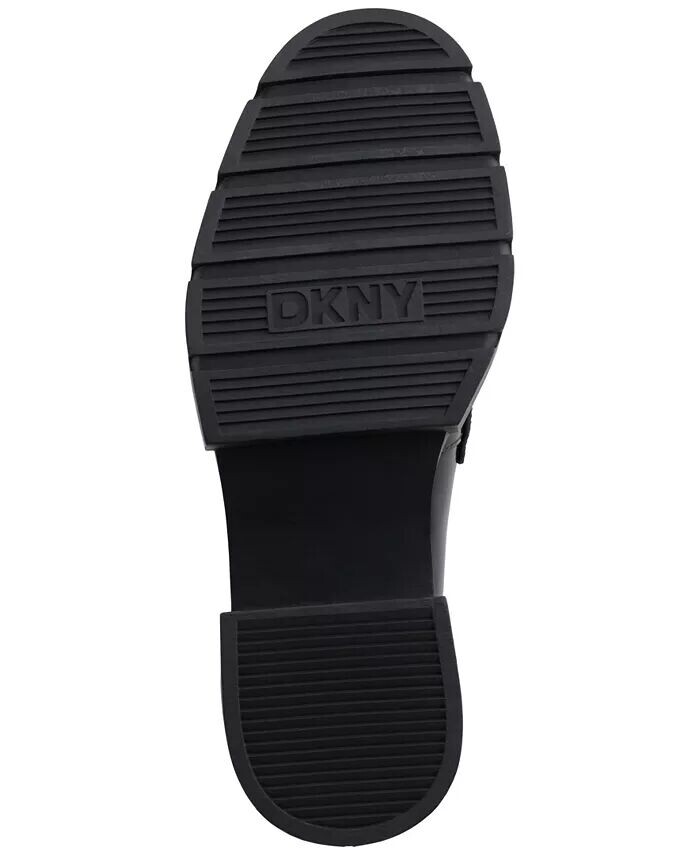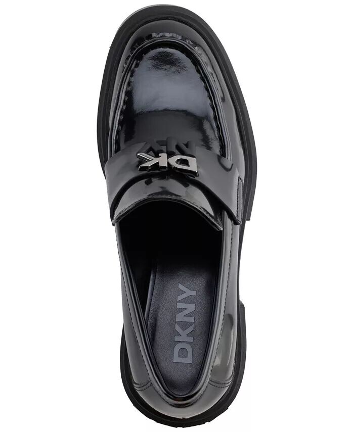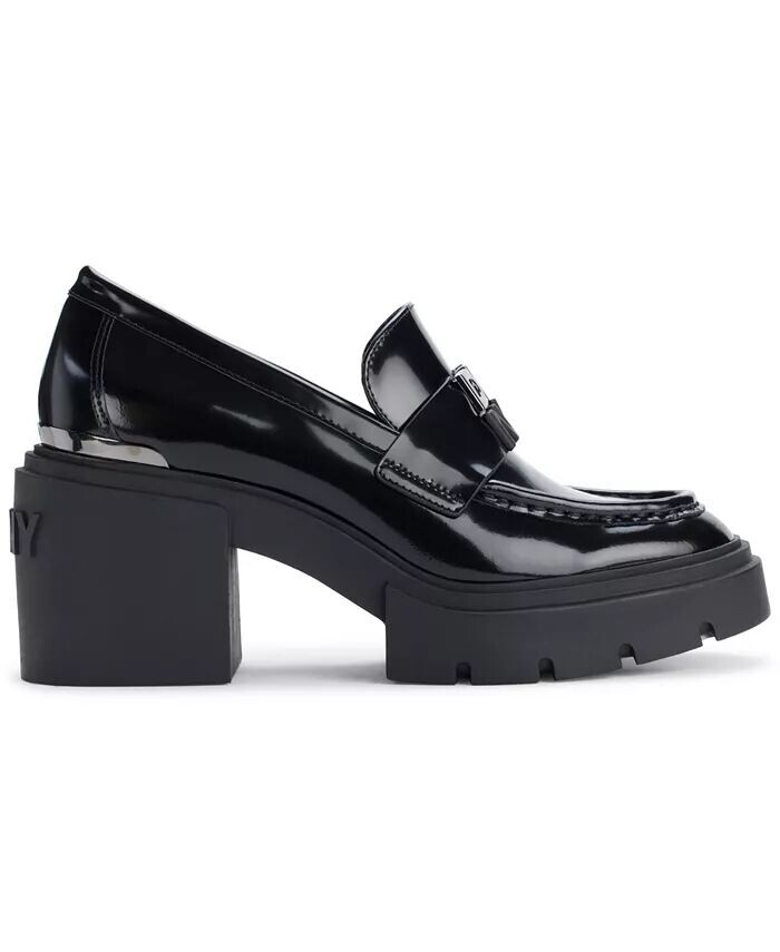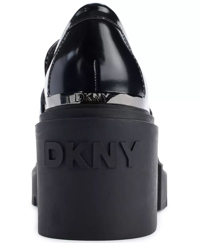 Фирменная женская фурнитура DKNY создает визуальную интригу на высоких туфлях-лоферах на массивной платформе.