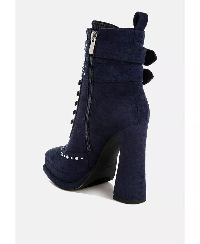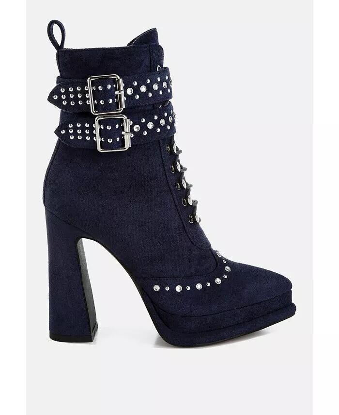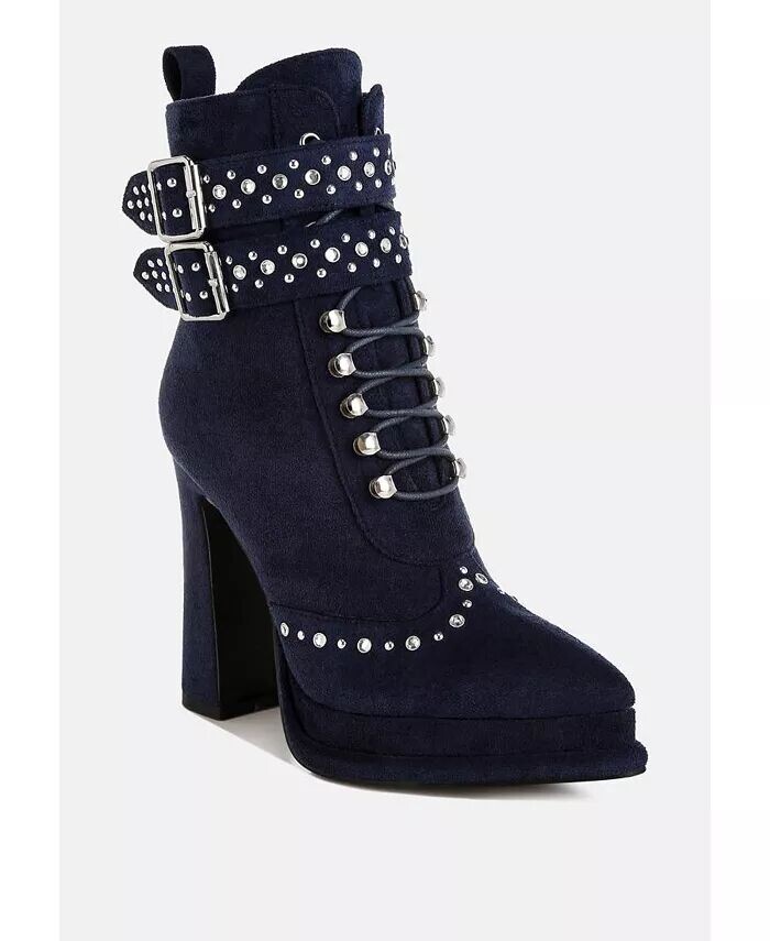 Сапоги из микрофибры радуют глаз заклепками и стразами, деталями сбруи, шнуровкой с люверсами, которые придают ботинкам ретро-шикарный вид. У сапог высокий блочный каблук с расклешенным носком, что придает сапогам интригующий силуэт.