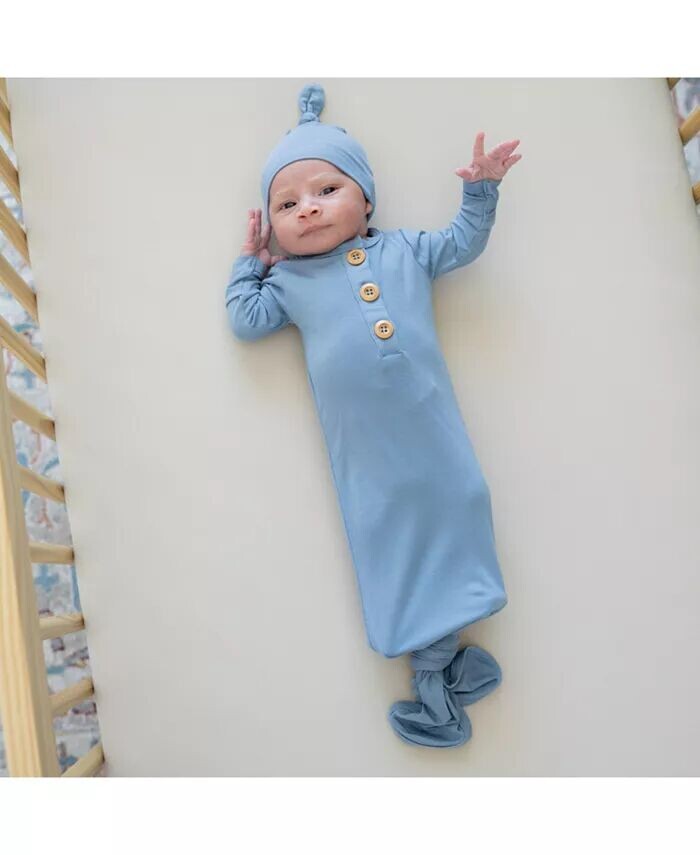 Это платье с узелками сделано из мягкой бамбуковой вискозы, которая нежна для нежной кожи вашего новорожденного и идеально тянется для движения бедер. Завязка снизу делает смену подгузников легкой, а деревянные пуговицы спереди добавляют очаровательного очарования. Соответствующая шапочка с узелками - последний штрих к идеальному образу, чтобы объявить о появлении вашего малыша.
