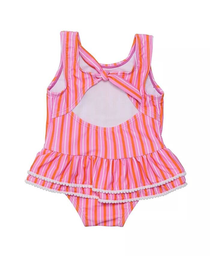 Этот купальник с юбкой передает цвета заката с его яркой розовой и коралловой полосатой тканью, акцентированной игривыми белыми мини-помпонами по краю. Разработанный для удобства и легкости, он имеет завязку на шее сзади, что делает его идеальным для юных искателей приключений, жаждущих морских развлечений.
