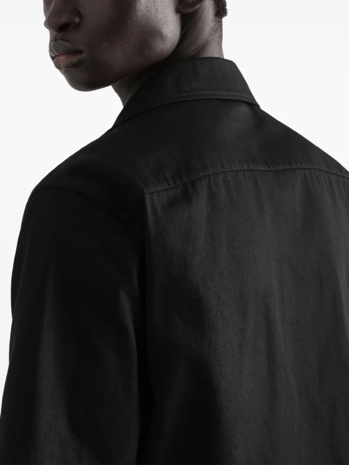 Черная застежка на пуговицы спереди, нагрудный накладной карман, прямой подол, воротник-стойка