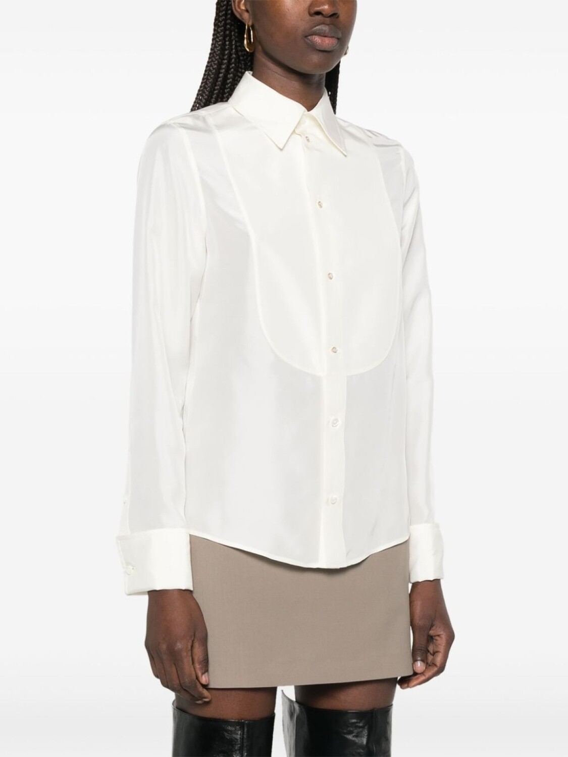 Цвет экрю, застежка на пуговицы спереди, классический воротник, длинные рукава, французские манжеты