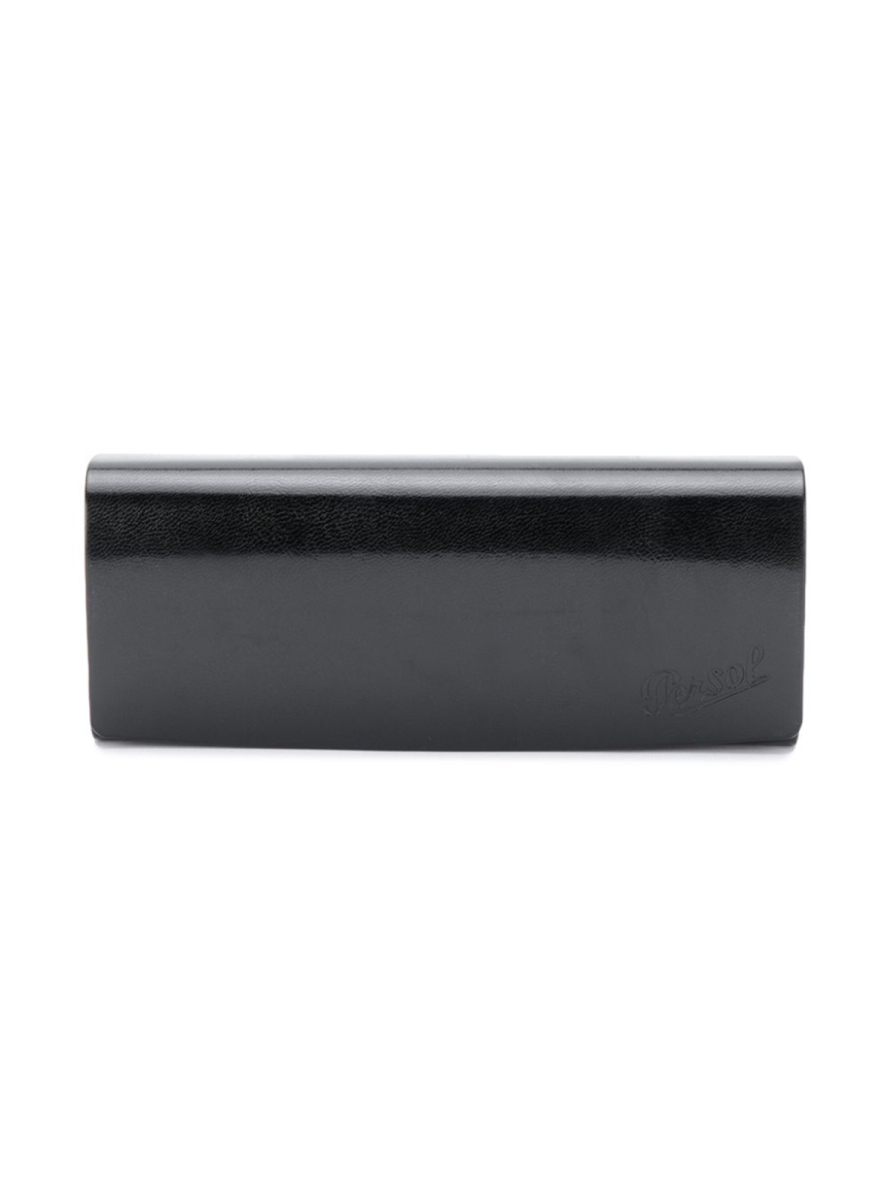 Солнцезащитные очки в круглой оправе от Persol. Эффект черепашьего панциря, темные линзы, серебристая фурнитура и прямые дужки с изогнутыми концами. Прилагается защитный чехол.