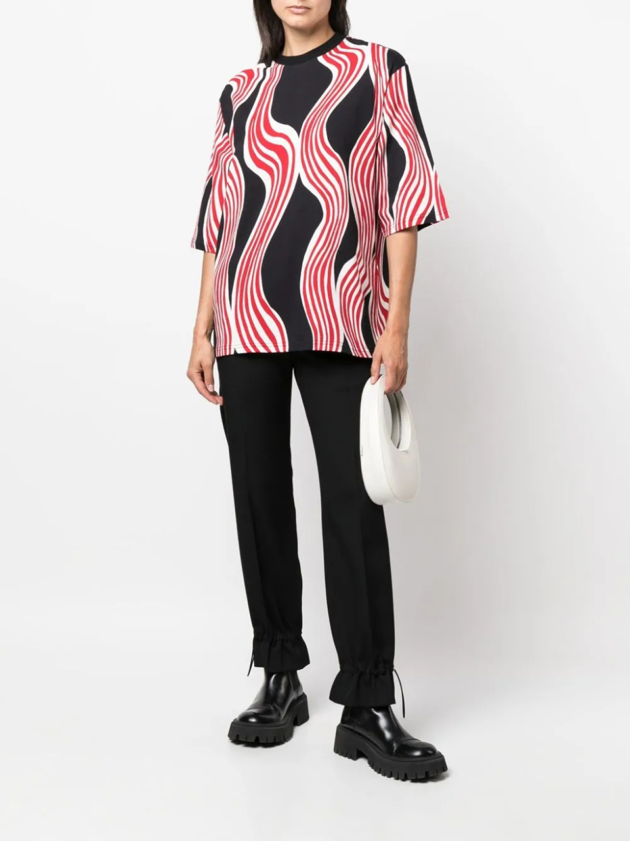 Хлопок, абстрактный принт, вышитый логотип сзади, круглый вырез, короткие рукава и прямой подол.