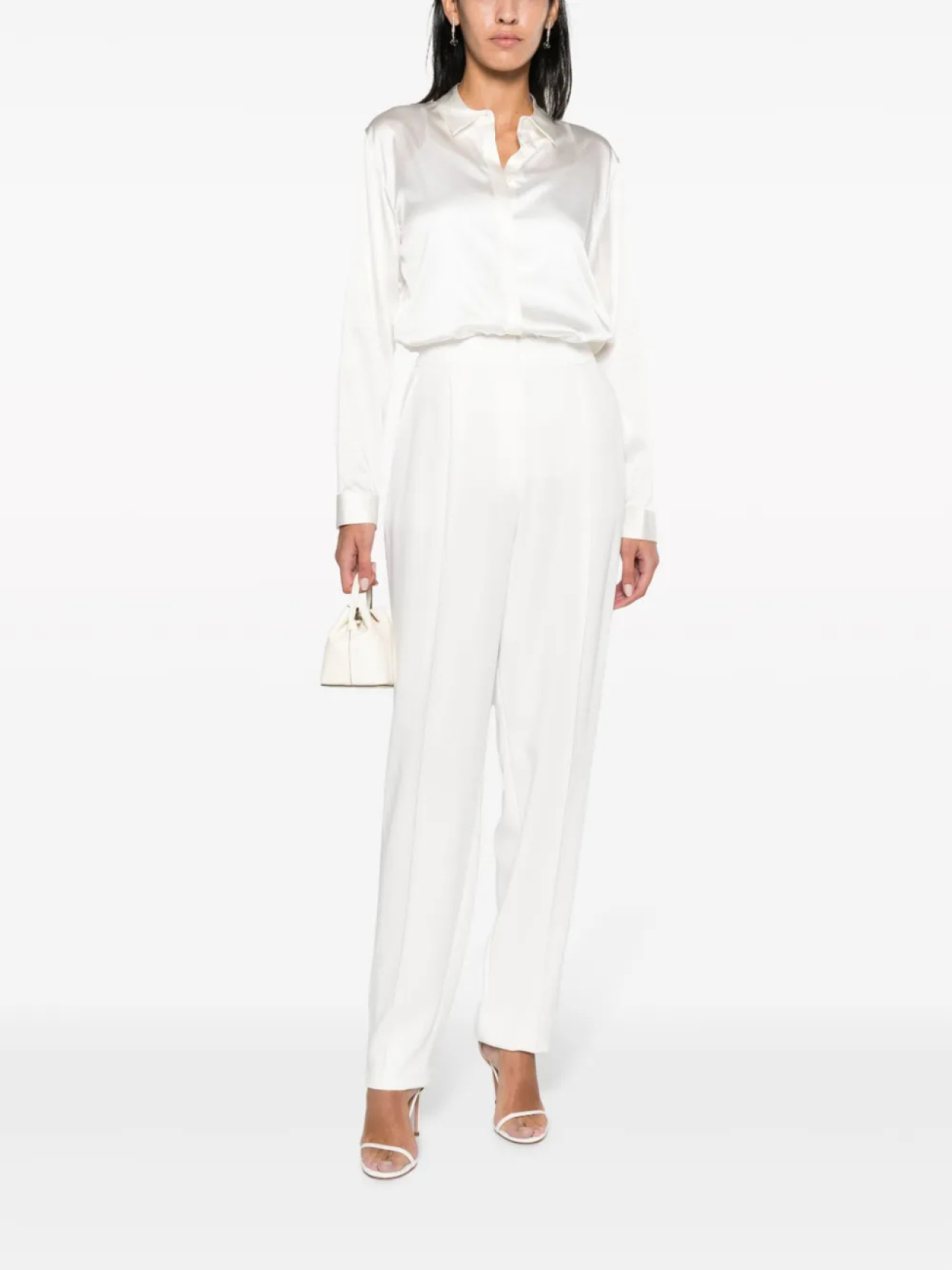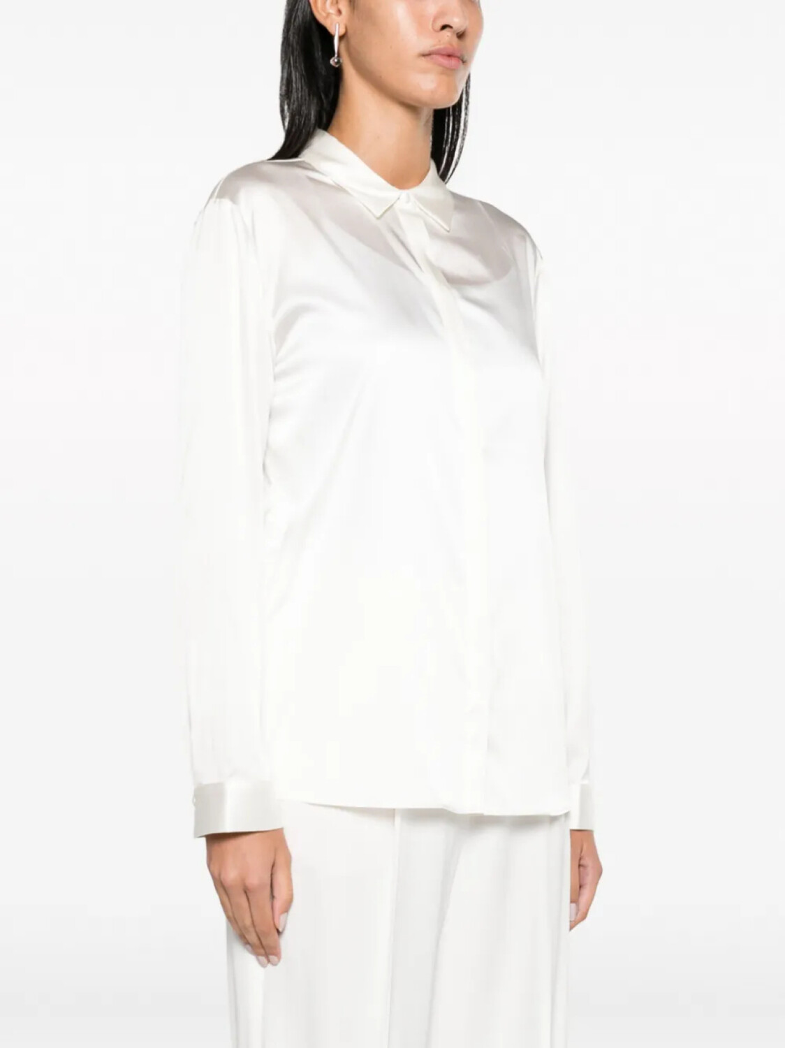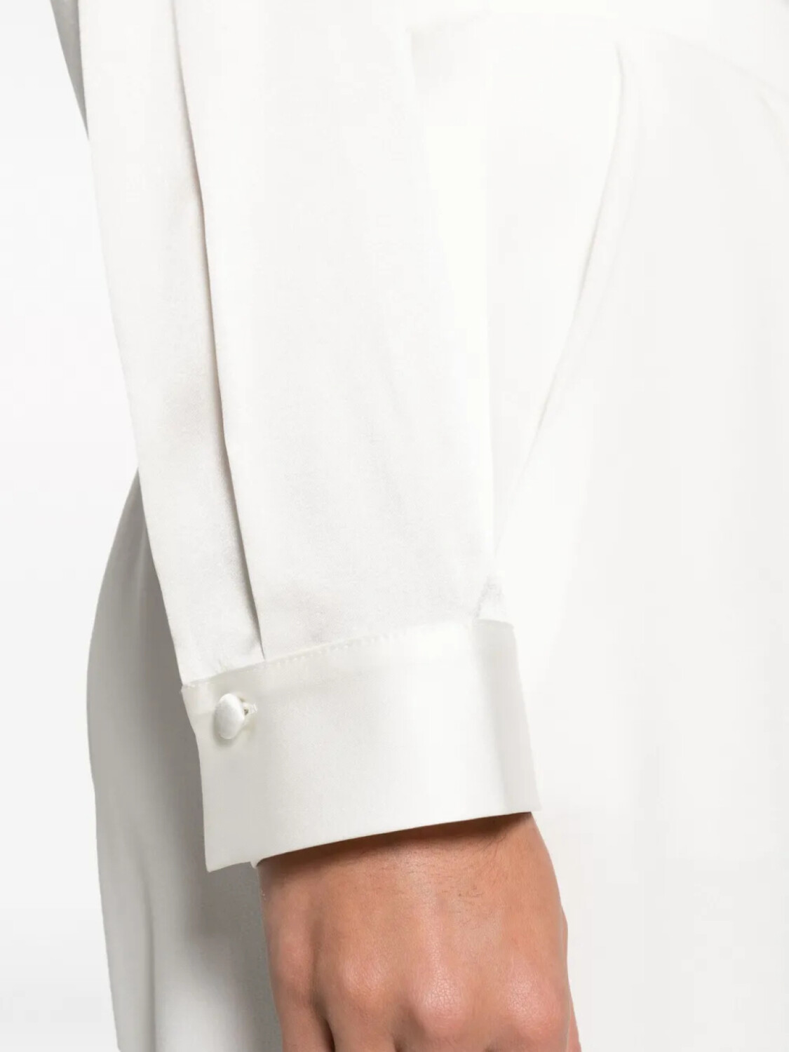 Классический воротник, потайная пуговичная застежка спереди, длинные рукава, манжеты на пуговицах и прямой подол. Цвет: белый.