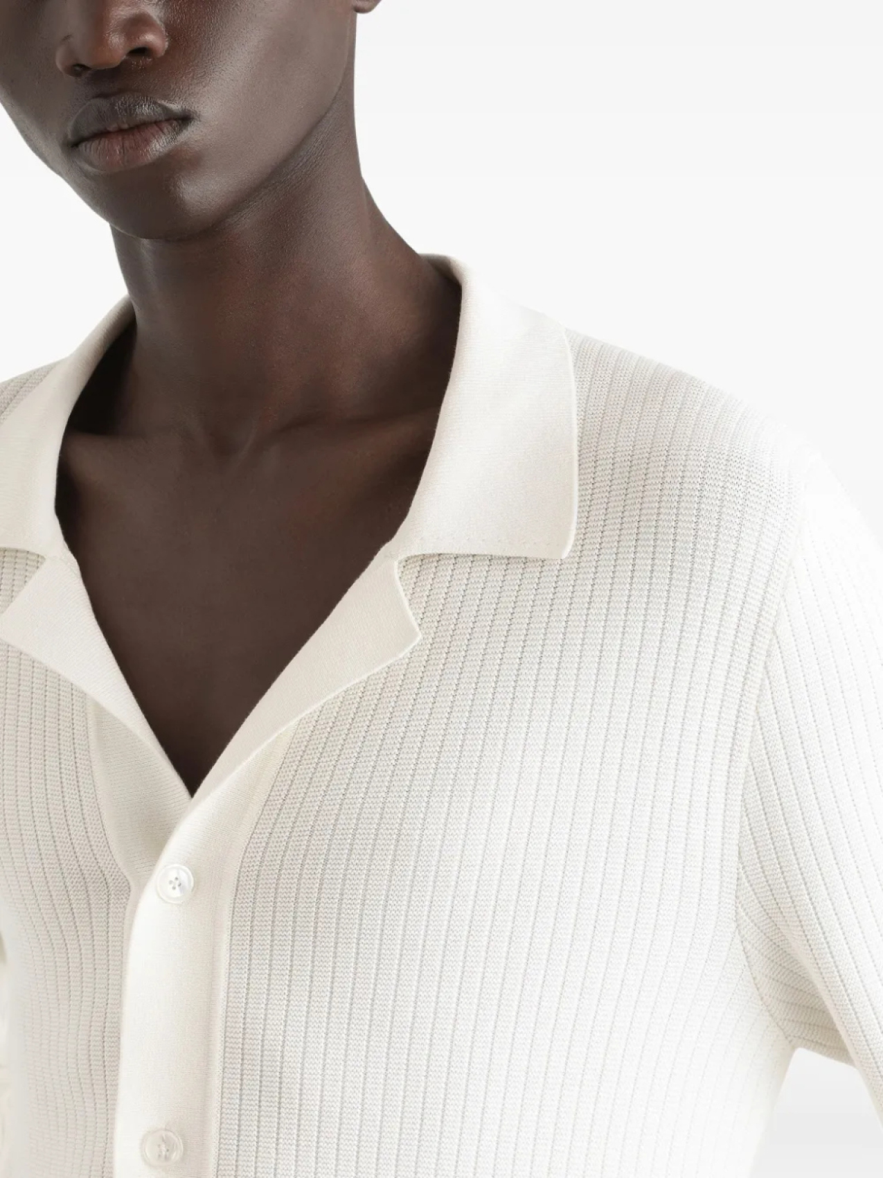 Белая застежка на пуговицы спереди, воротник с вырезом, ребристые манжеты и подол