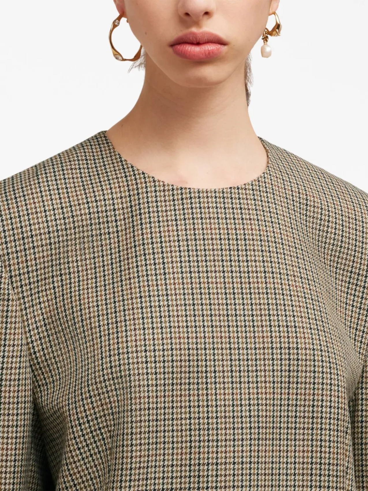 Бежевый, шерсть, принт в клетку, круглый вырез, длинные рукава, два прорезных кармана по бокам, длина до бедер, потайная застежка на молнии сзади и прямой подол.