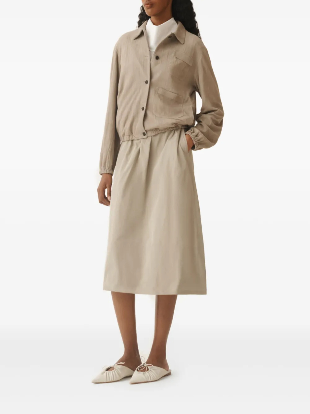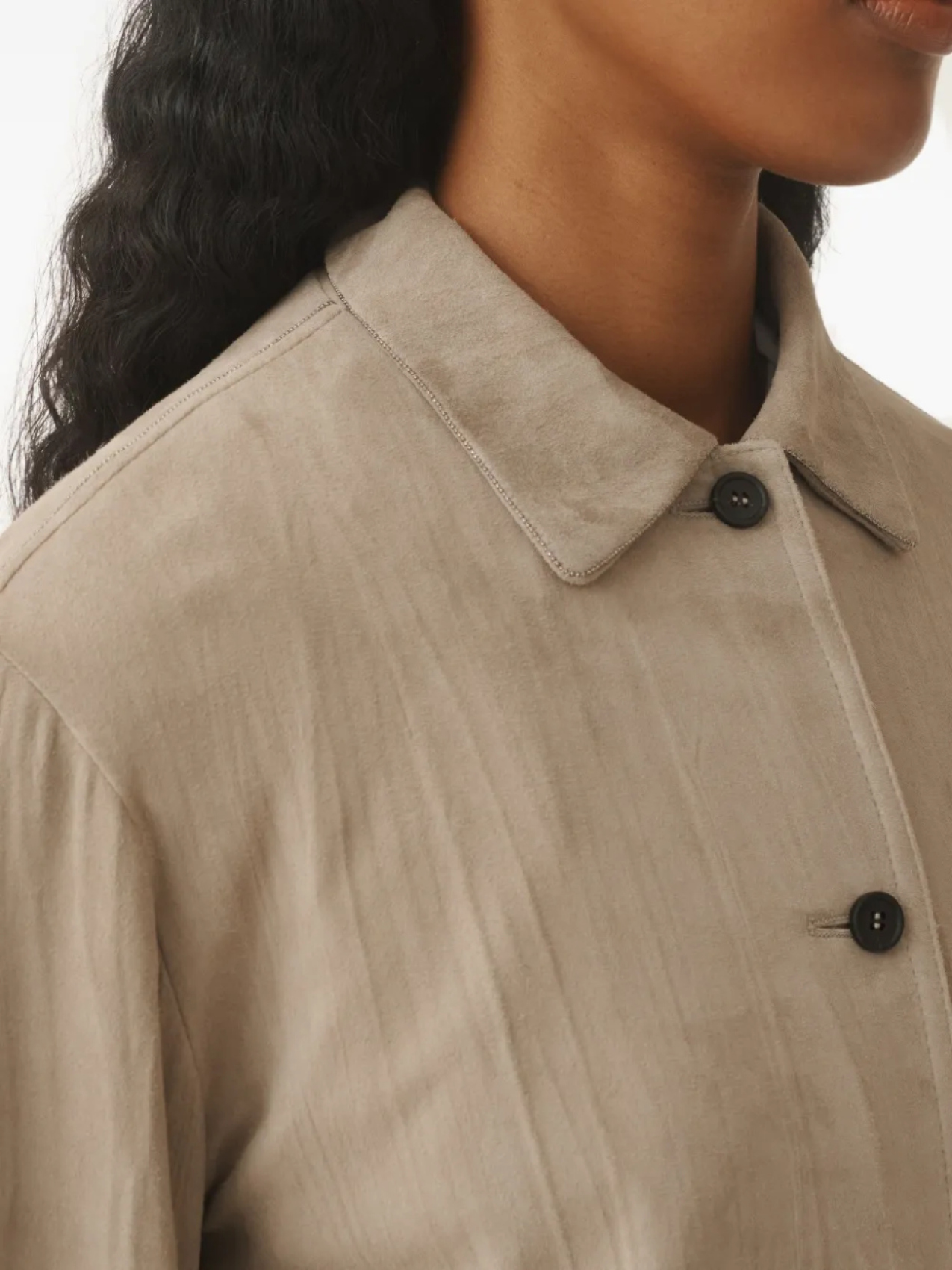 Миндально-бежевого цвета, застежка на пуговицы спереди, нагрудный карман с клапаном, накладной карман спереди, эластичный подол