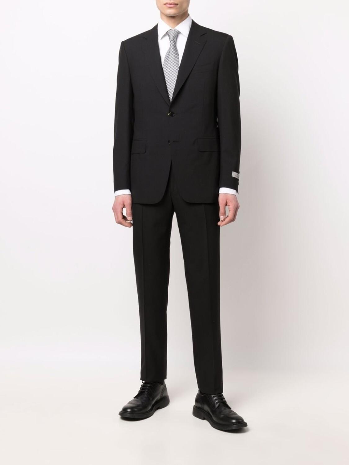Строгий крой, зазубренные лацканы, прорезной карман на груди, два передних кармана с клапанами, застежка на пуговицах спереди, длинные рукава, манжеты на пуговицах, две боковые шлицы сзади, строгий крой, стрелки, потайная застежка на молнии и пуговицах, два прорезных кармана по бокам, два прорезных кармана на пуговицах сзади и петли для ремня. Цвет: черный.