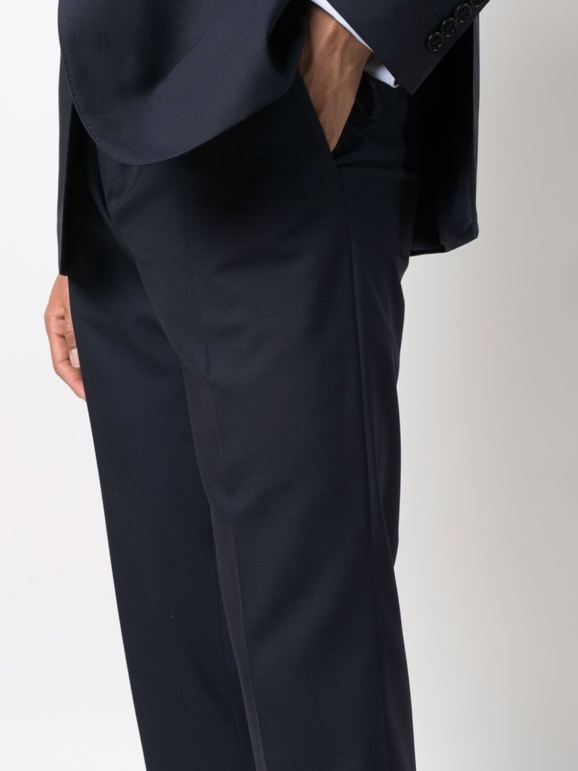Зазубренные лацканы, застежка на пуговицах спереди, два кармана с клапанами по бокам, две боковые шлицы сзади, подплечники, средняя посадка, петли для ремня, два вшитых кармана по бокам и карман на пуговице сзади. Цвет: синий.