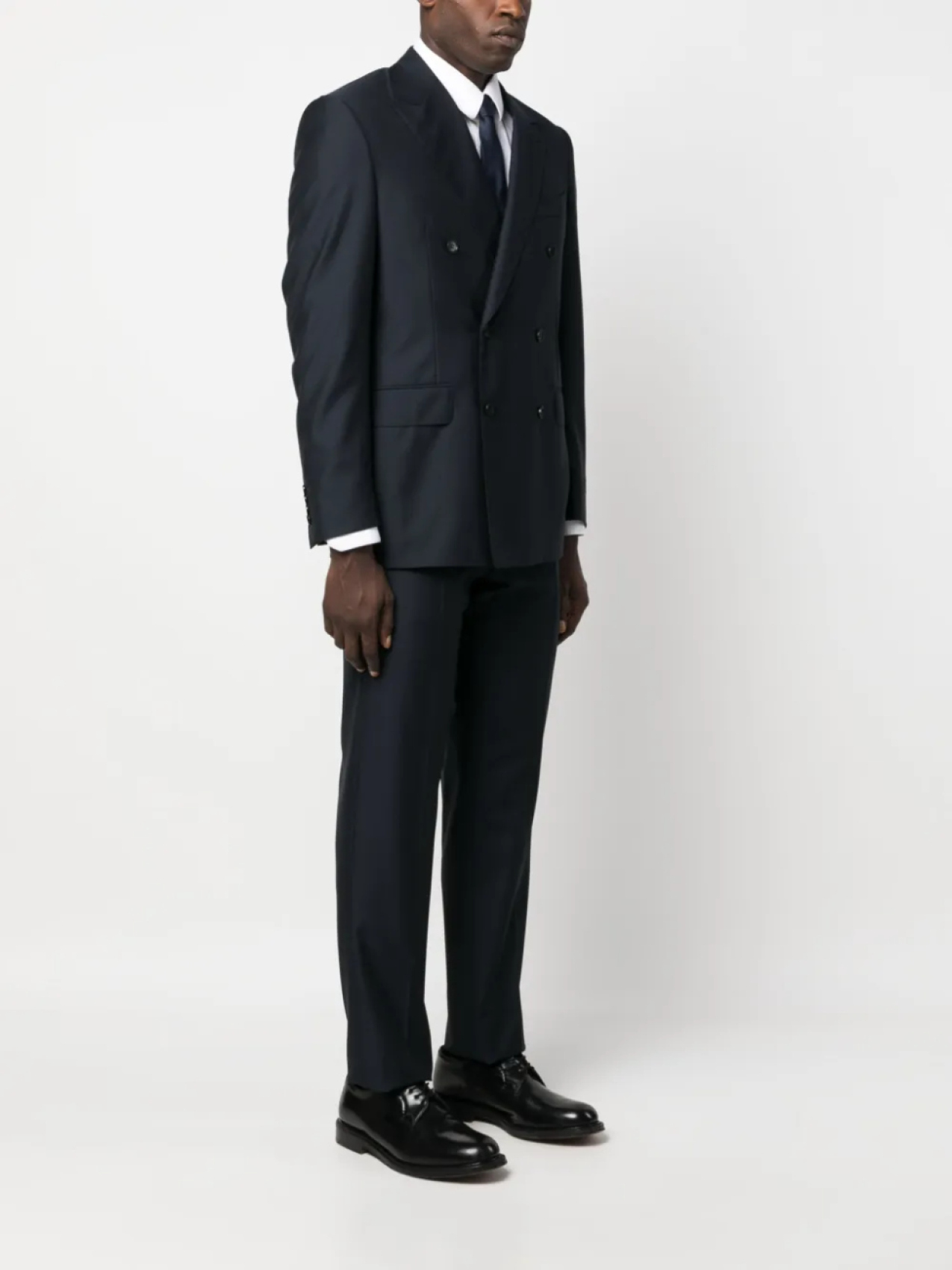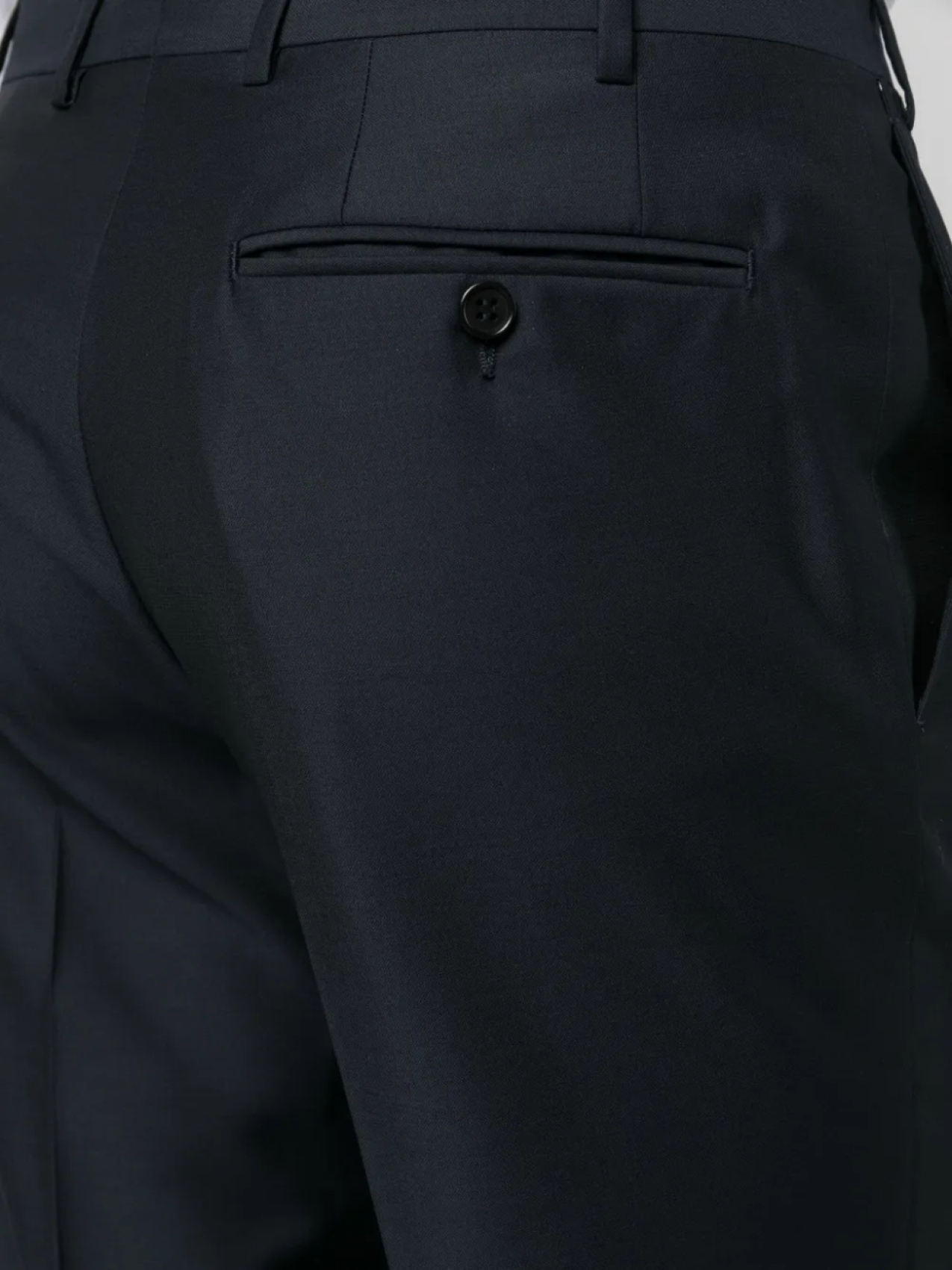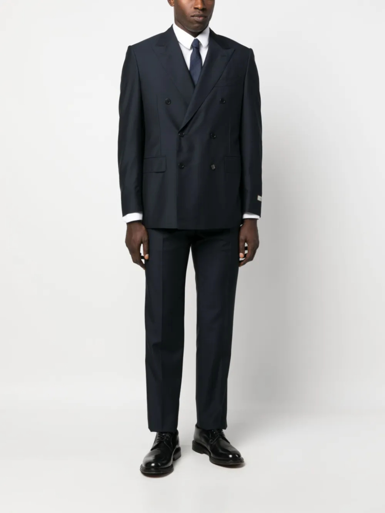Темно-синий, шерсть, нашивка с логотипом на рукаве, заостренные лацканы, застежка на пуговицах спереди, длинные рукава, манжеты на пуговицах, нагрудный прорезной карман, два передних кармана с клапанами, прямой подол, цельная подкладка, узкий крой, стрелки, петли для ремня, два вшитых кармана по бокам и два кармана с листочкой сзади.