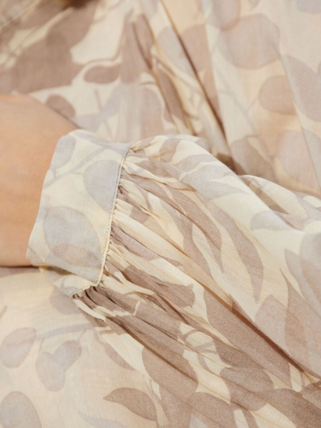 Песочно-бежевый, застежка на пуговицы спереди, цветочный принт по всей поверхности, без воротника, длинные рукава-фонарики