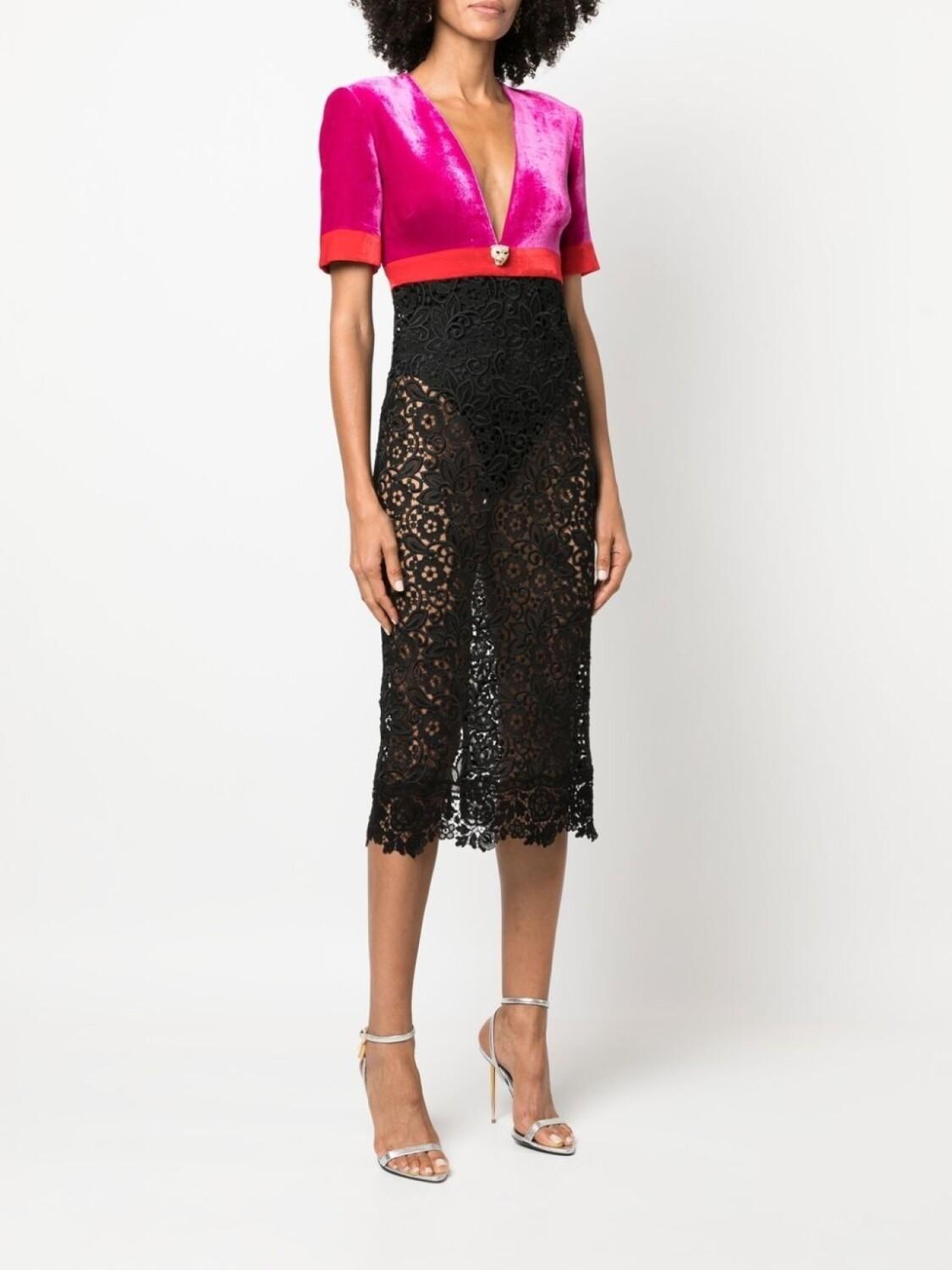 Черный, розовый, красный, бархат, смесовый шелк, вставки из кружева, вставки, V-образный вырез, короткие рукава, застежка на молнии сзади, полупрозрачный дизайн и длина миди.