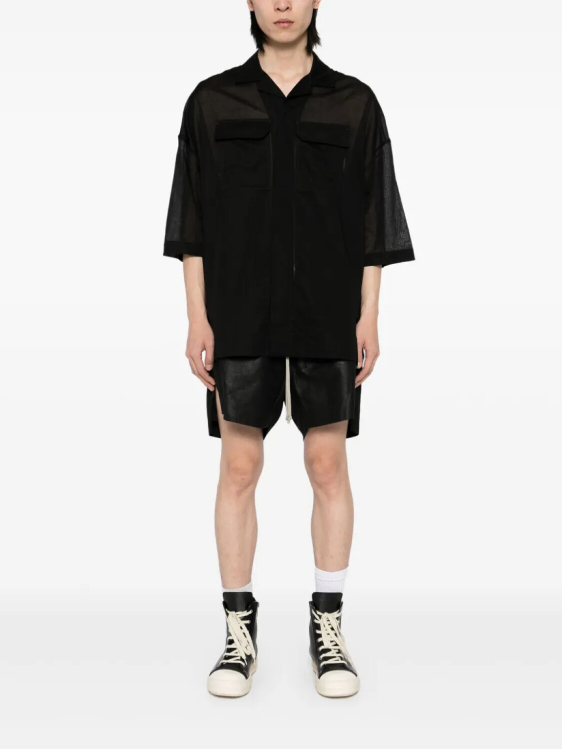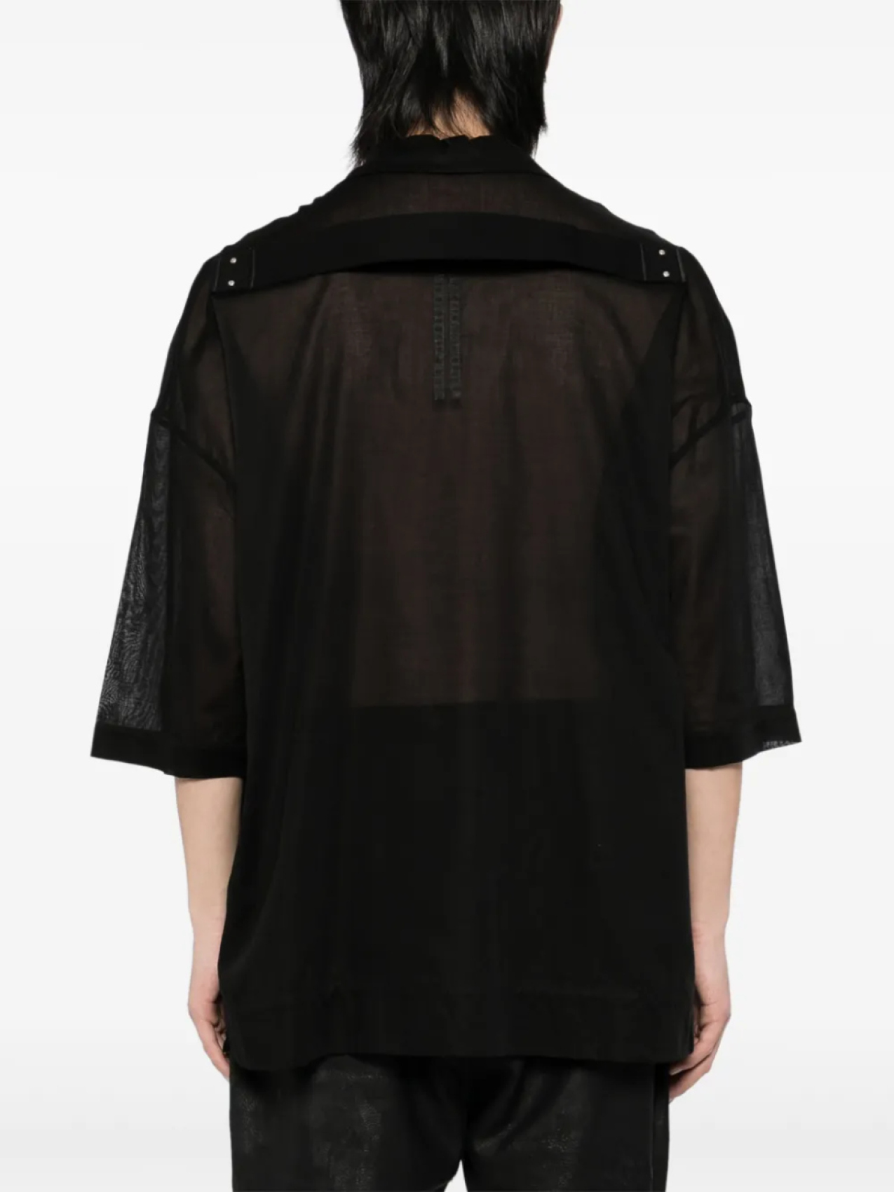 Черная застежка на пуговицы спереди, два нагрудных кармана на пуговицах, полупрозрачная конструкция