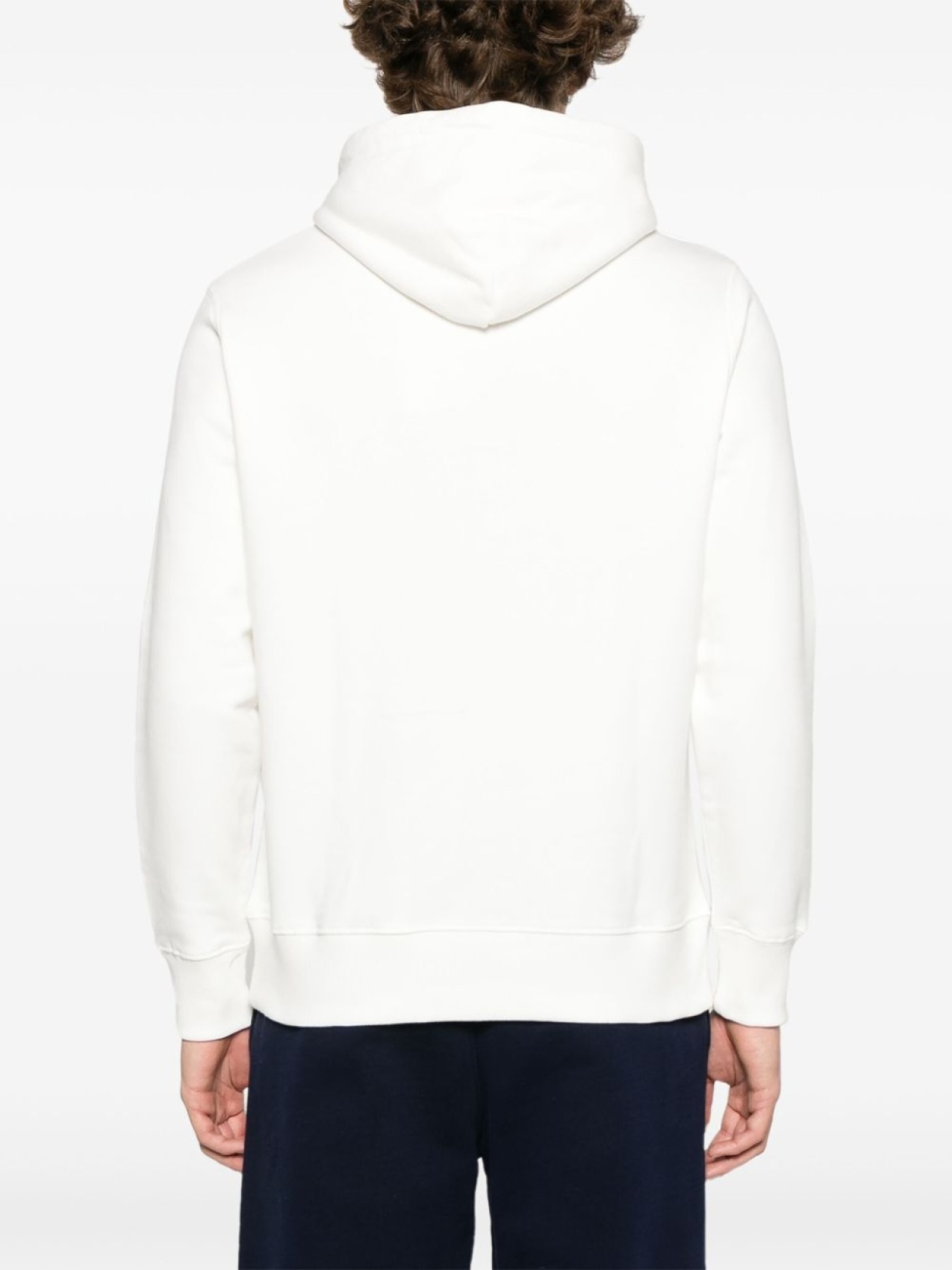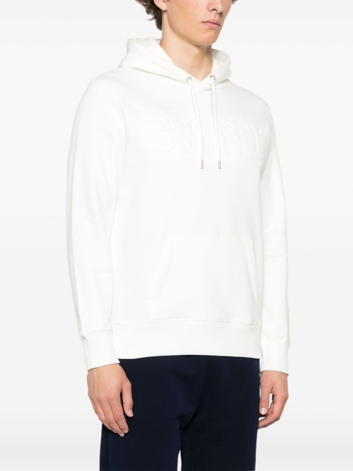 Белый капюшон на шнурке, длинные рукава, ребристые манжеты и подол, передний карман-кенгуру