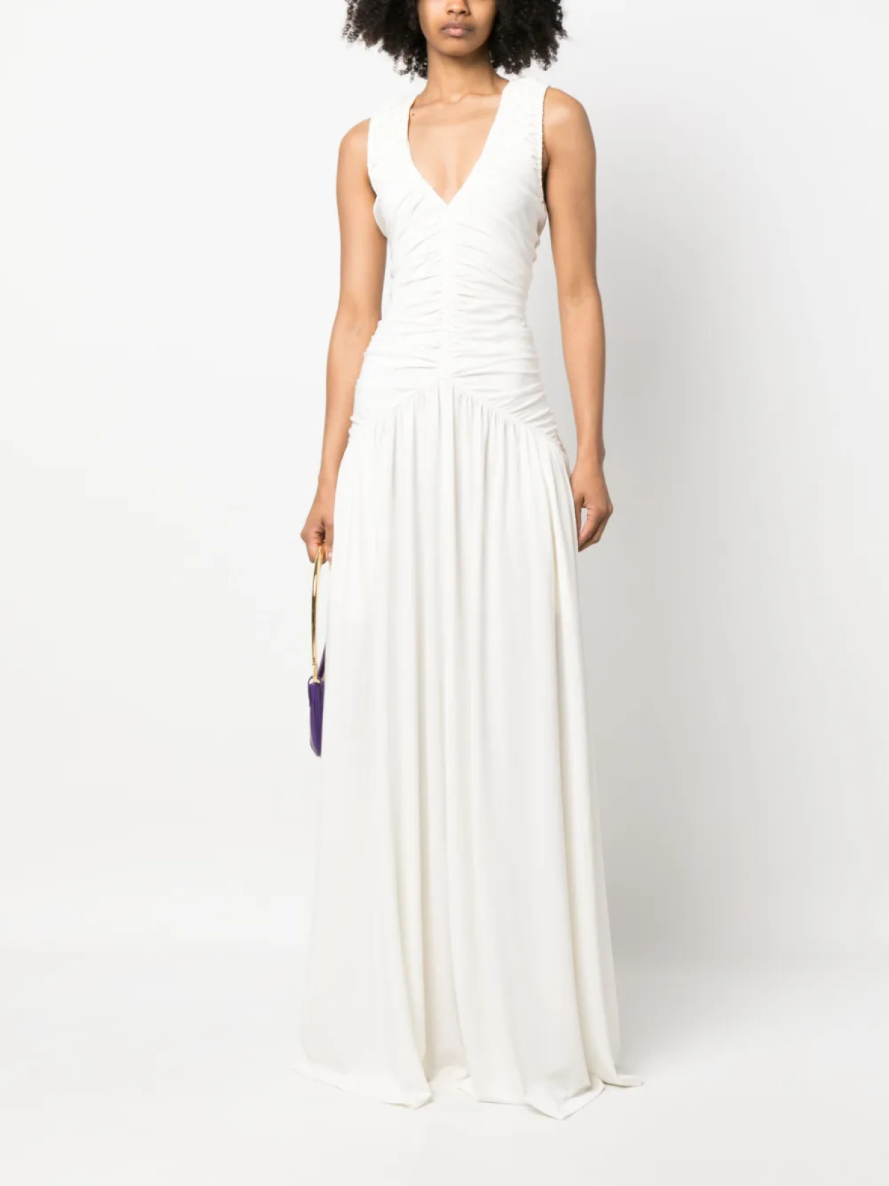 Кремово-белый, эластичный материал, присборенный лиф, V-образный вырез, без рукавов, застежка на молнии сзади, приталенный силуэт, расклешенная юбка и длина макси.
