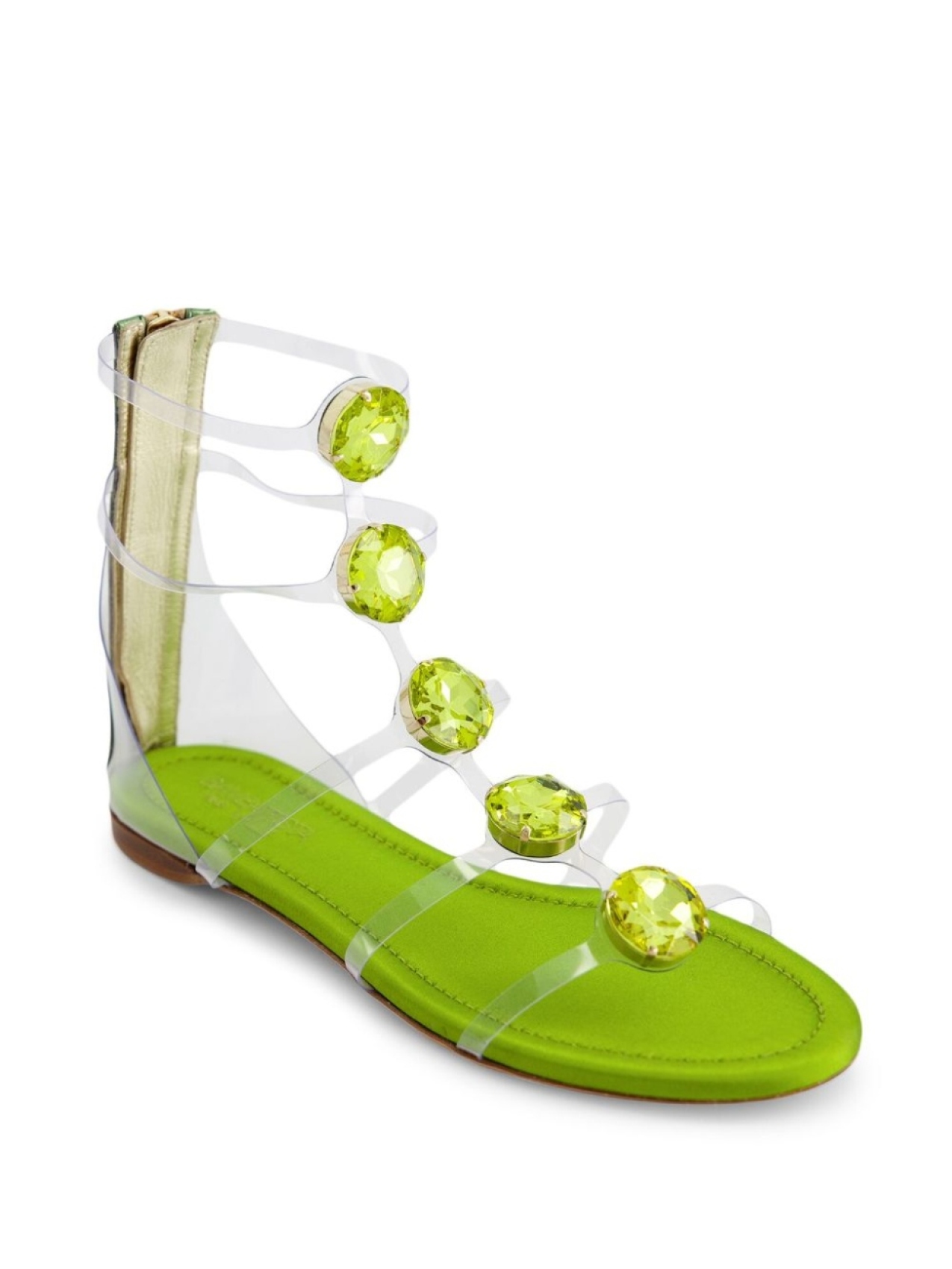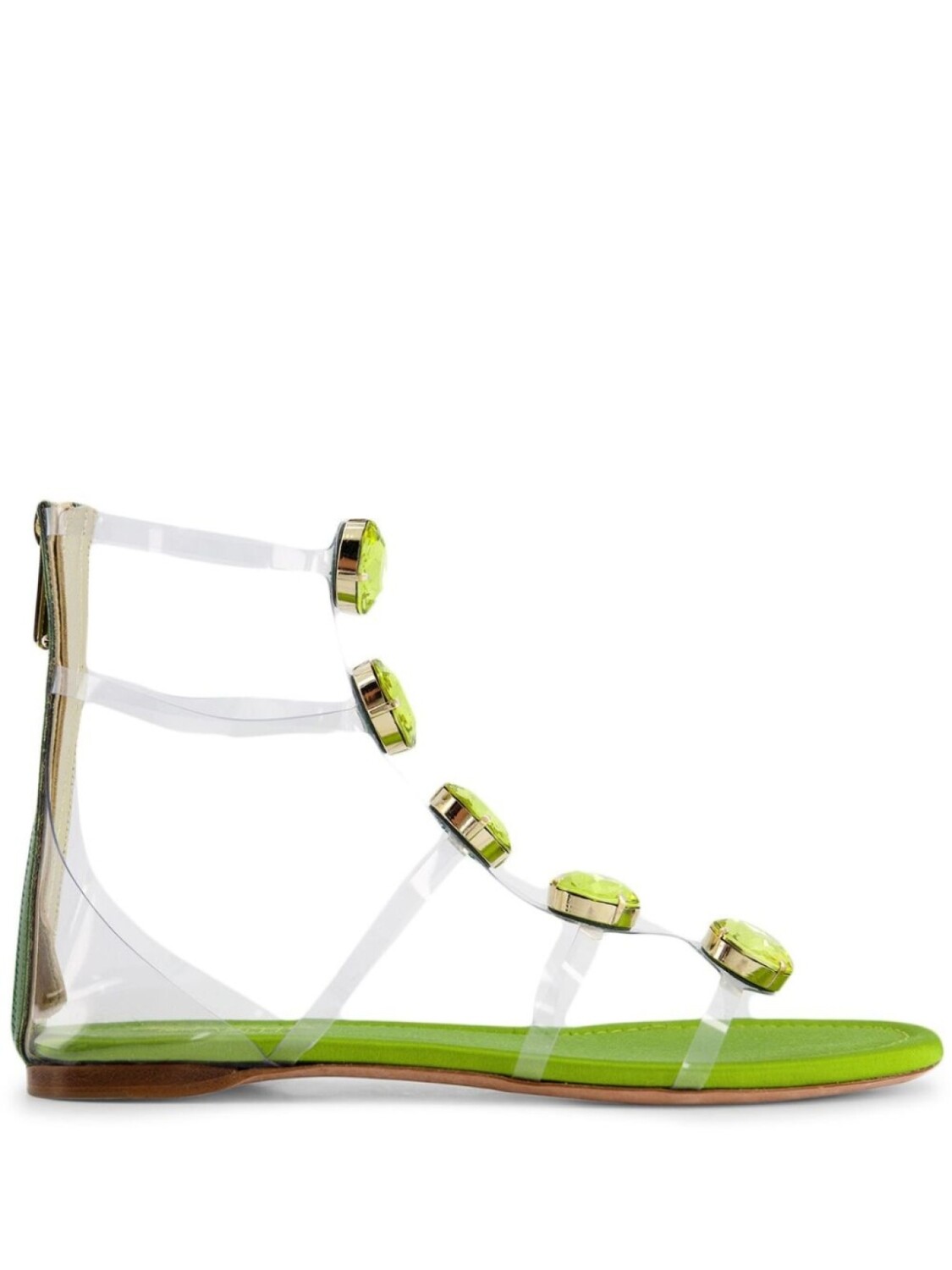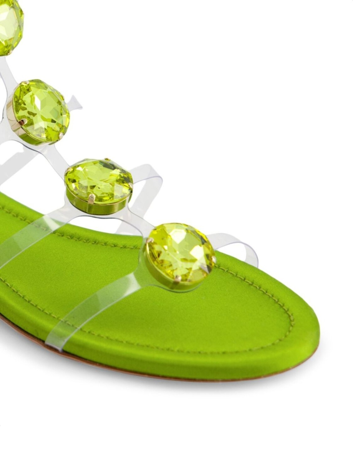 Цвет зеленого яблока, декор из кристаллов, открытый носок, кожаная стелька с логотипом, застежка на молнии сзади, золотистая фурнитура и плоская резиновая подошва.