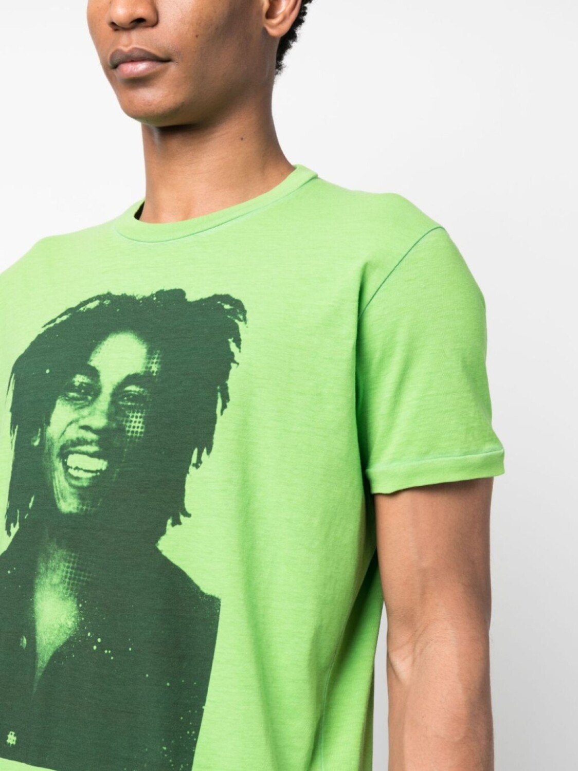 Цвет зеленой спаржи, хлопок, фотопринт, текстовый принт, круглый вырез, короткие рукава и прямой подол.