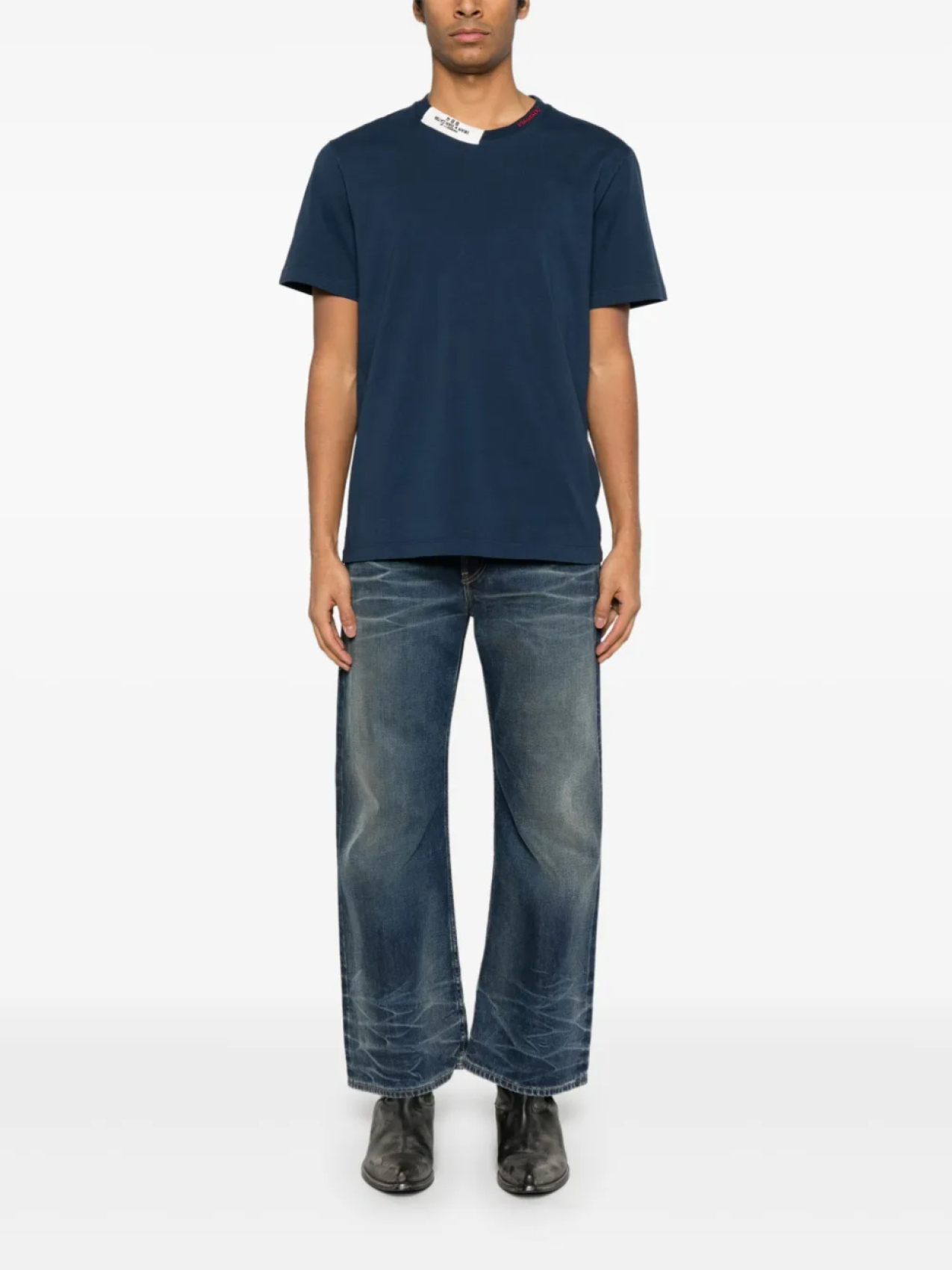 Темно-синий круглый вырез горловины с короткими рукавами и нашивкой