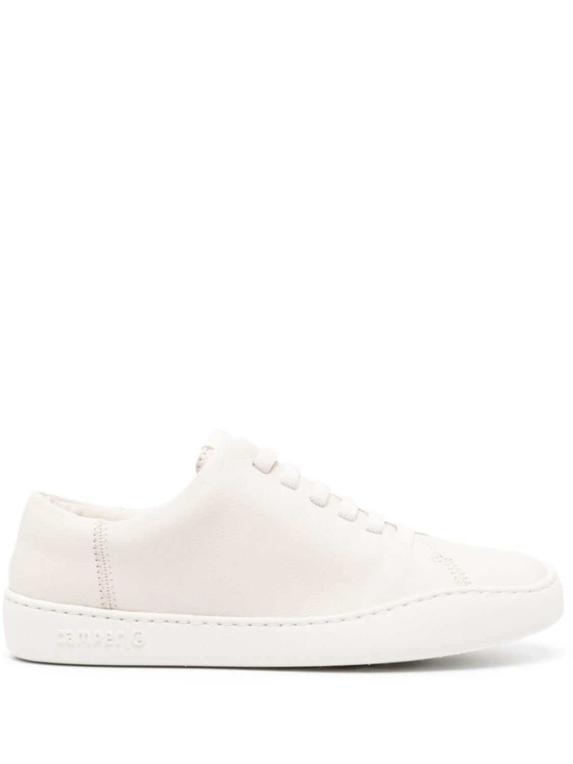 Белый, телячья кожа, гладкая текстура кожи, нашивка с логотипом на язычке, тисненый логотип сбоку, закругленный носок, шнуровка спереди, стелька с логотипом, плоская подошва и логотип на подошве.