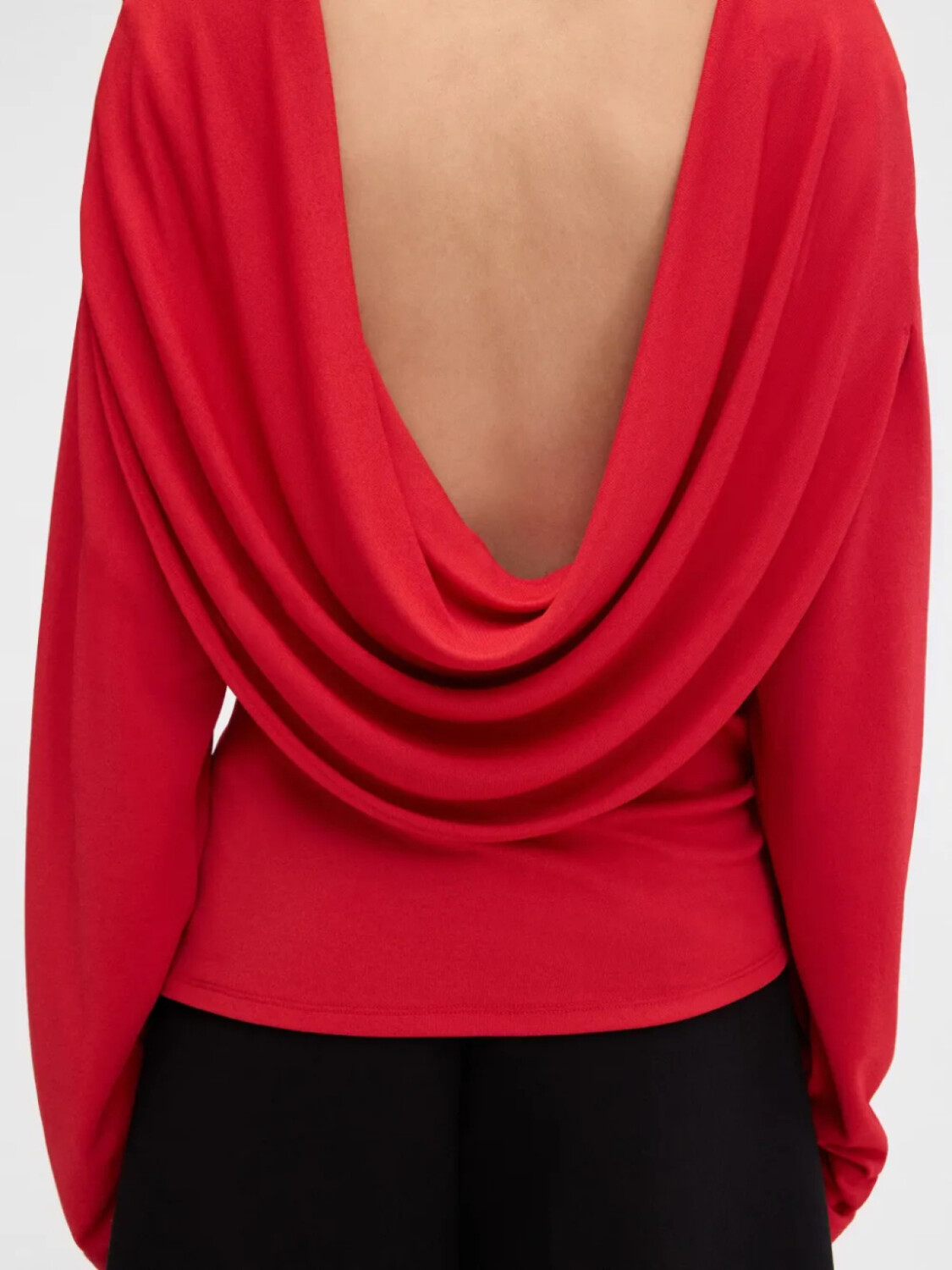 Ярко-красный вырез лодочкой, длинные рукава, драпировка сзади