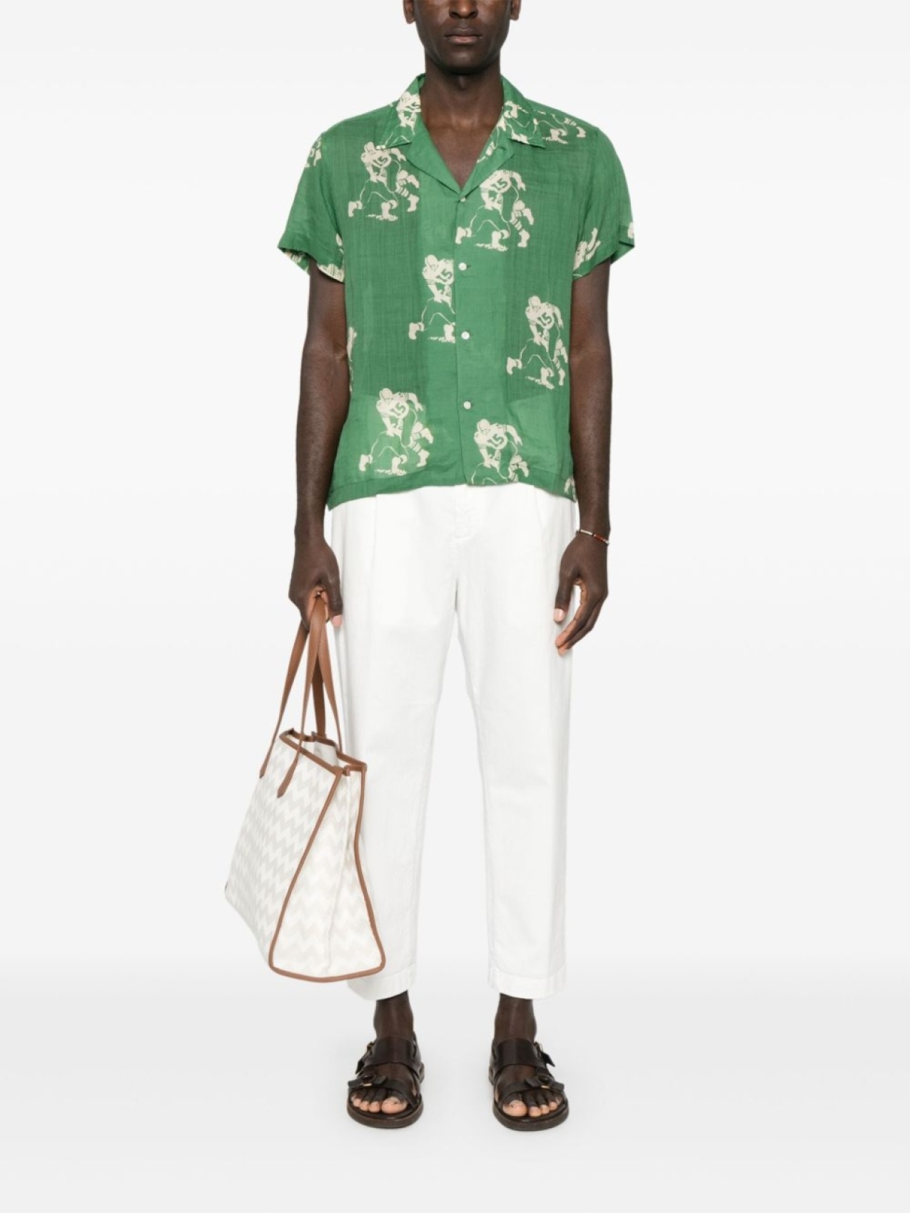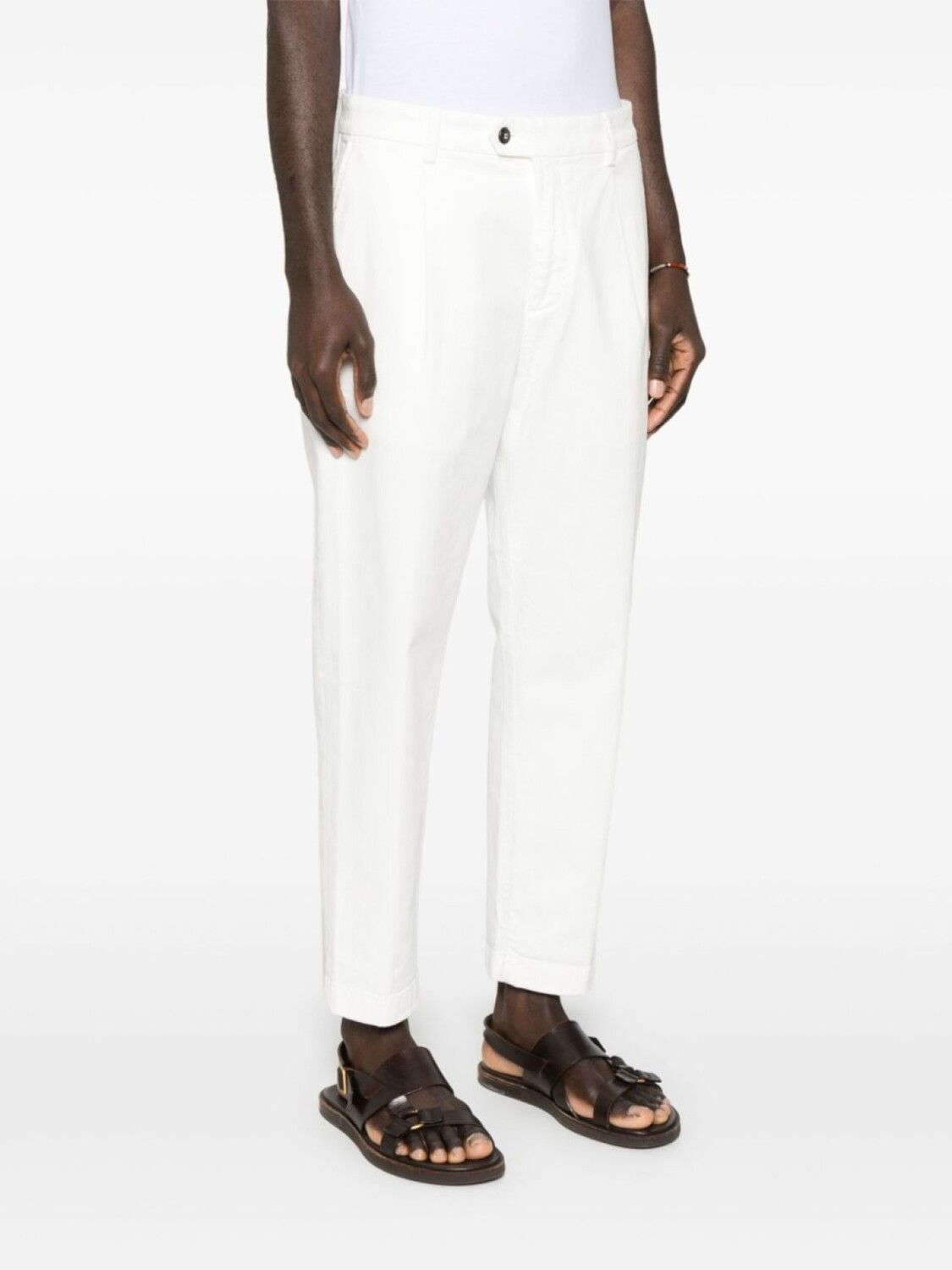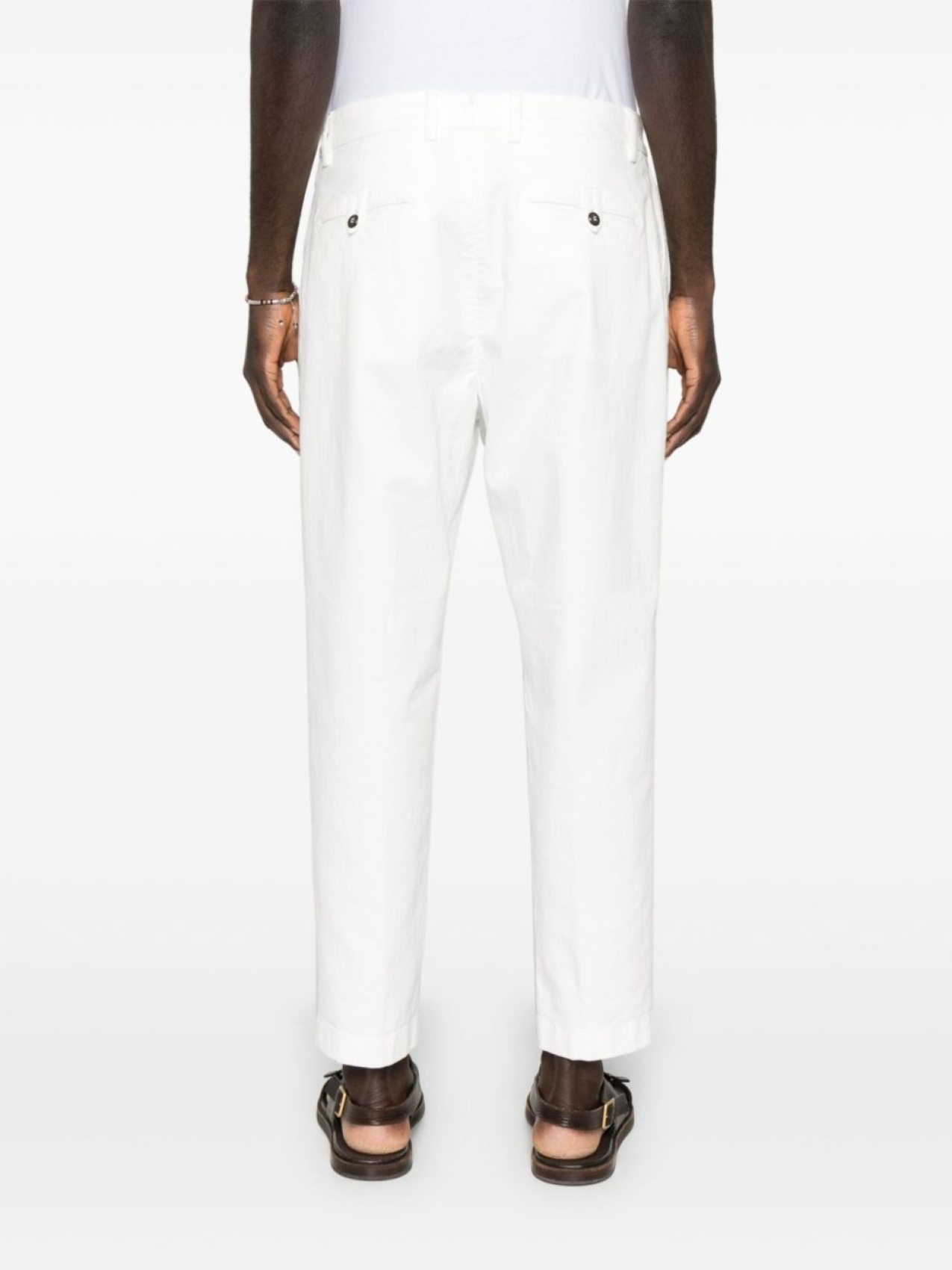 Белая потайная застежка на пуговицы и ширинку, шлевки для ремня, два прорезных кармана по бокам, два прорезных кармана сзади на пуговицах