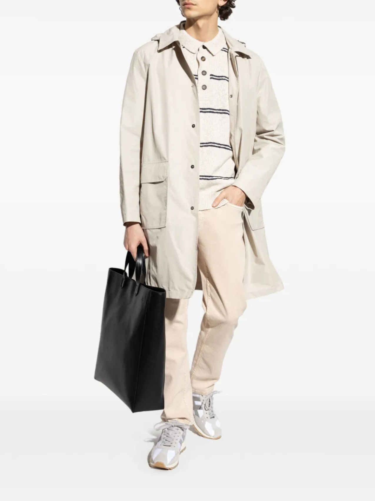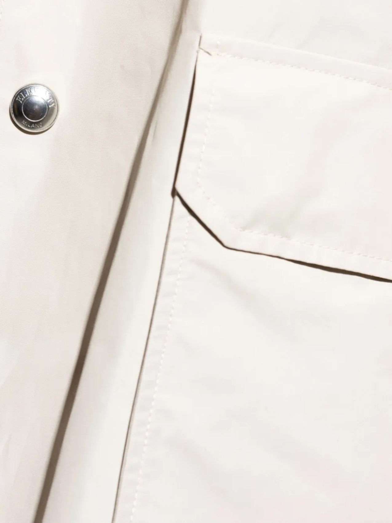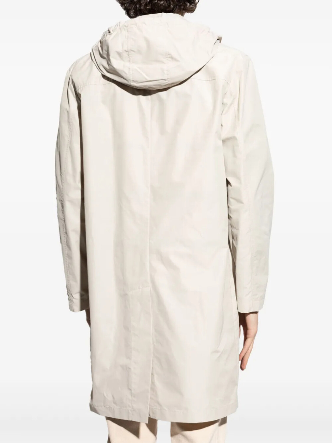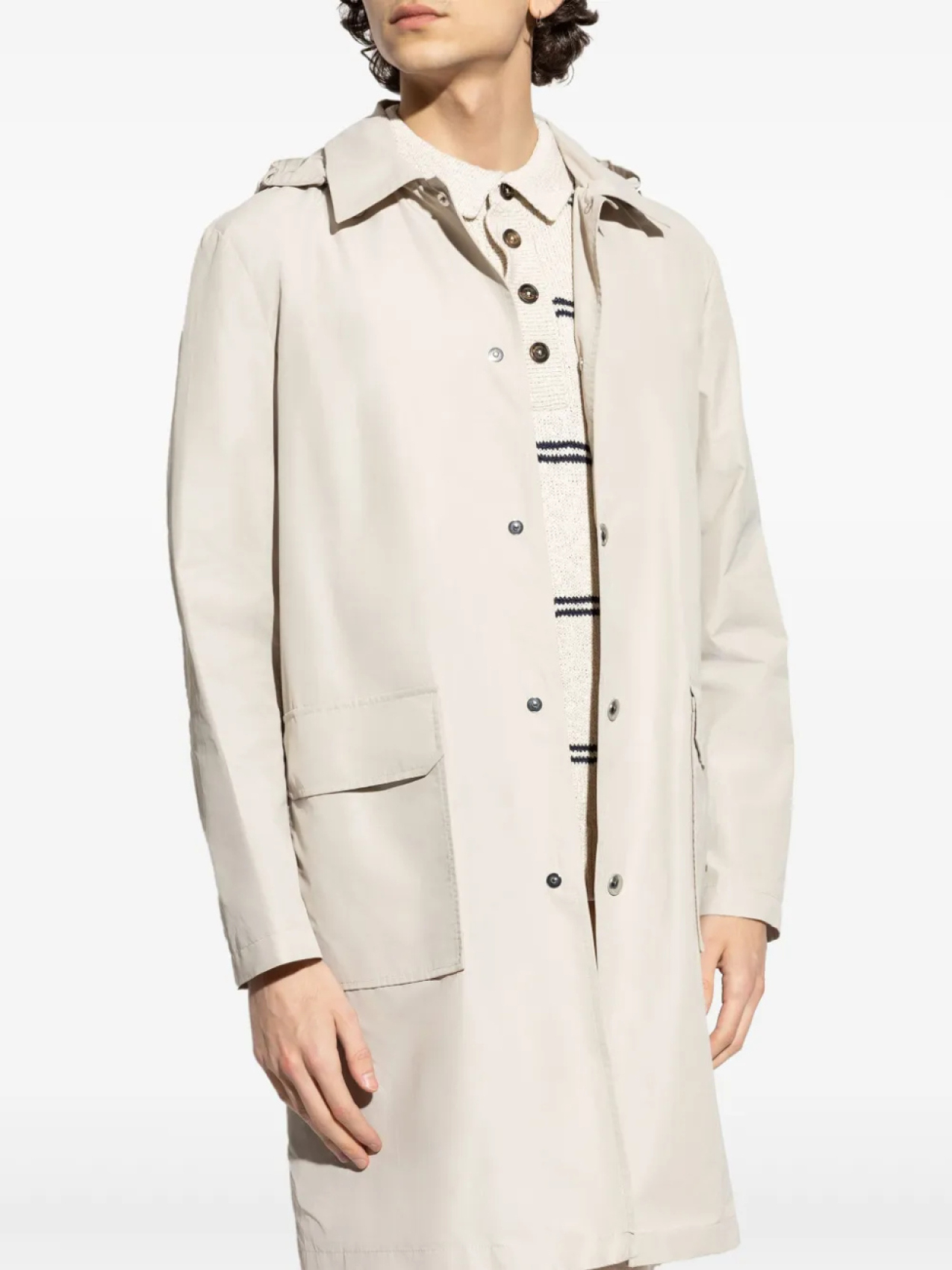 Светло-бежевый, застежка на кнопку, классический воротник, капюшон на шнурке, два накладных кармана по бокам