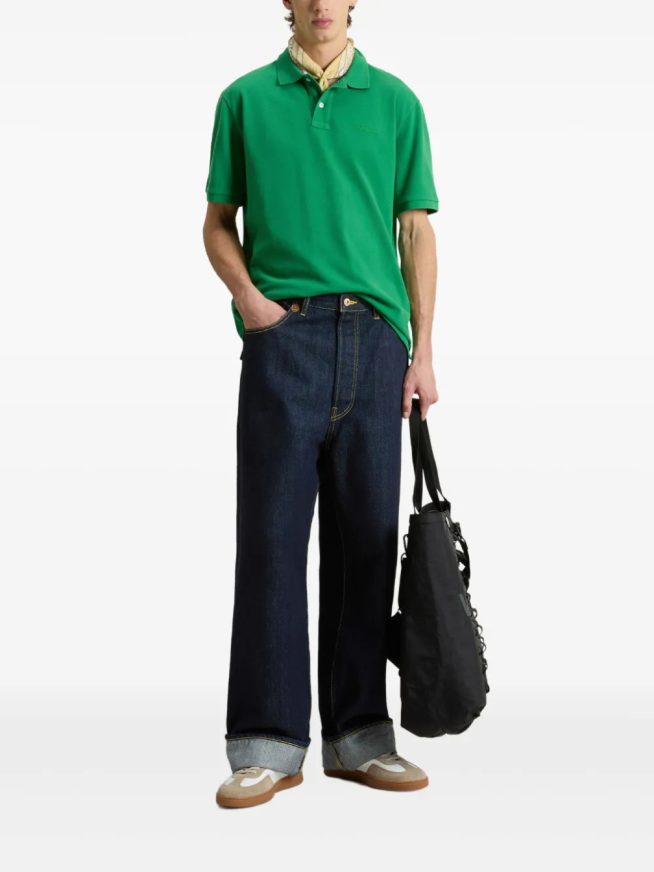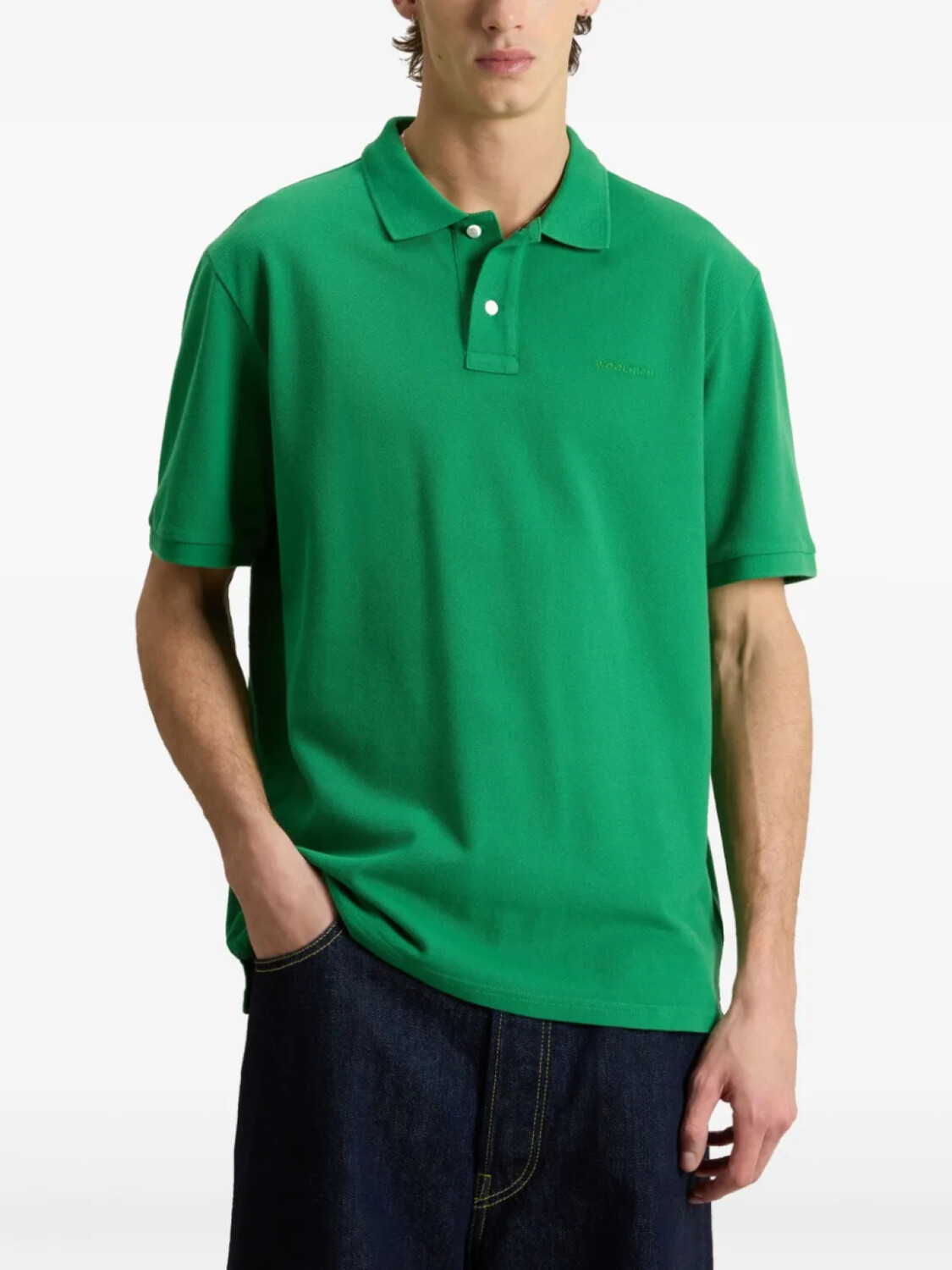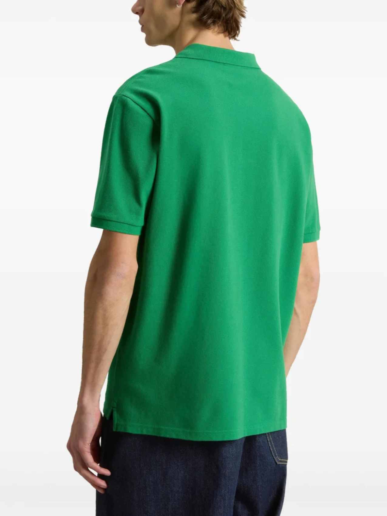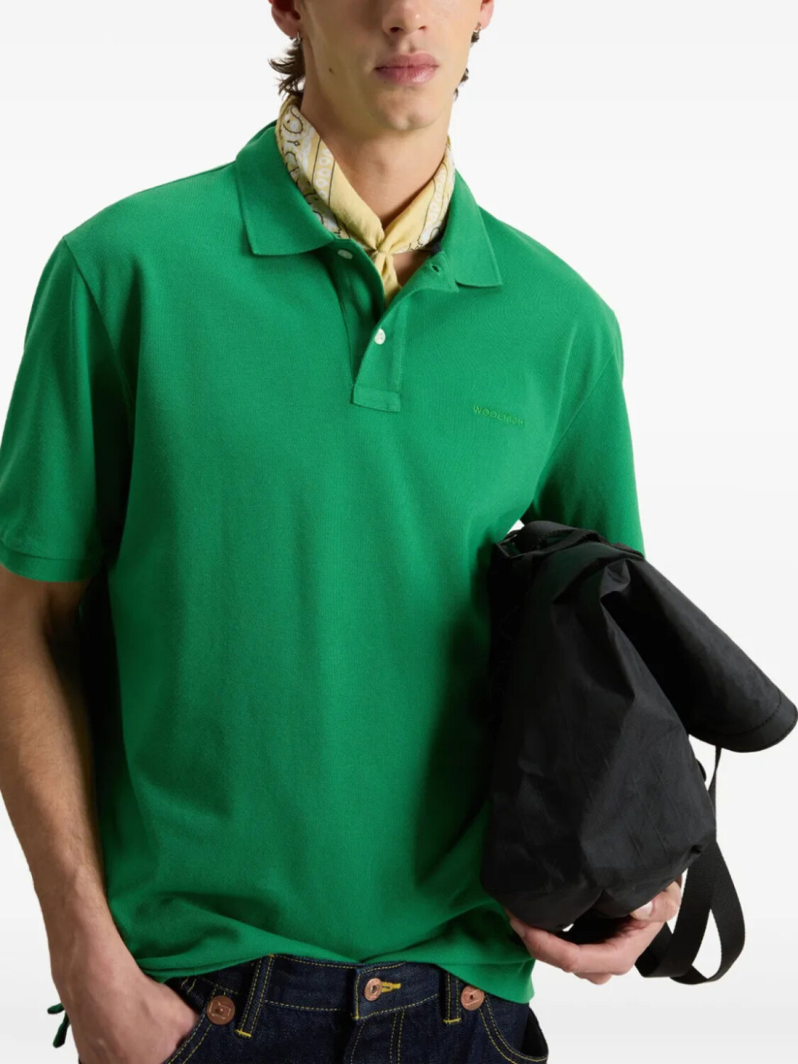 Ярко-зеленый традиционный воротник, планка с тремя пуговицами, вышитый логотип, короткие рукава, прямой подол