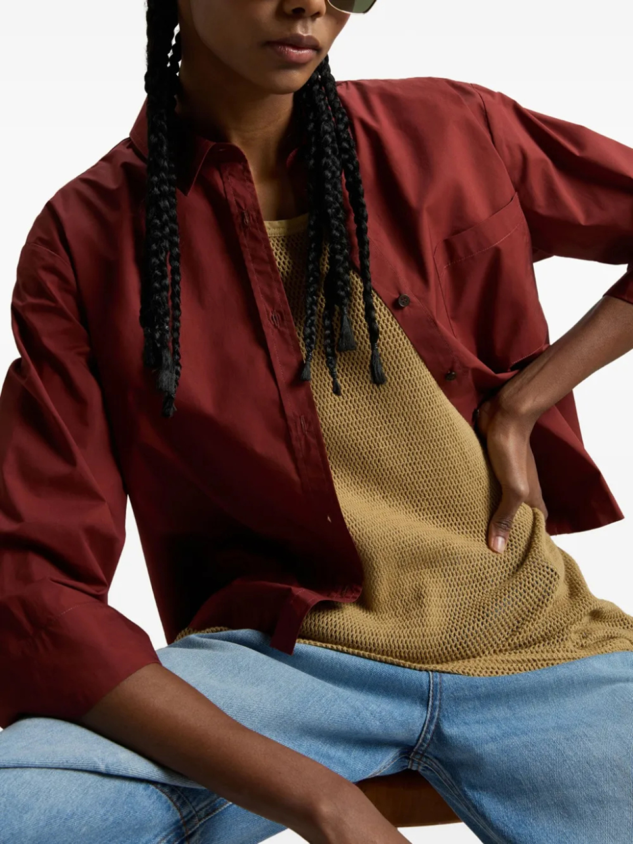Застежка на пуговицы спереди кирпично-красного цвета, накладной карман на груди, рукава три четверти, прямой подол