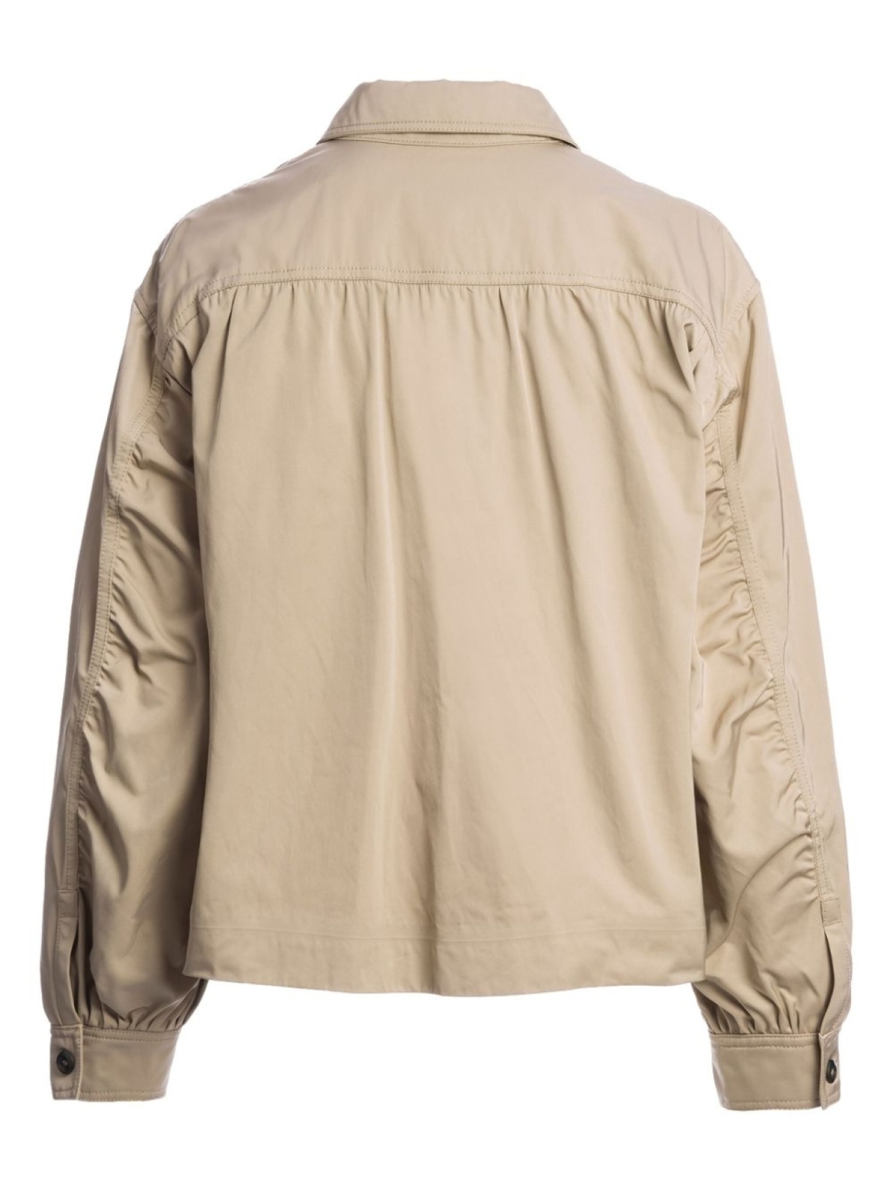 Песочно-бежевый, застежка на пуговицах спереди, два нагрудных кармана с клапанами, два прорезных кармана сбоку, эластичный пояс
