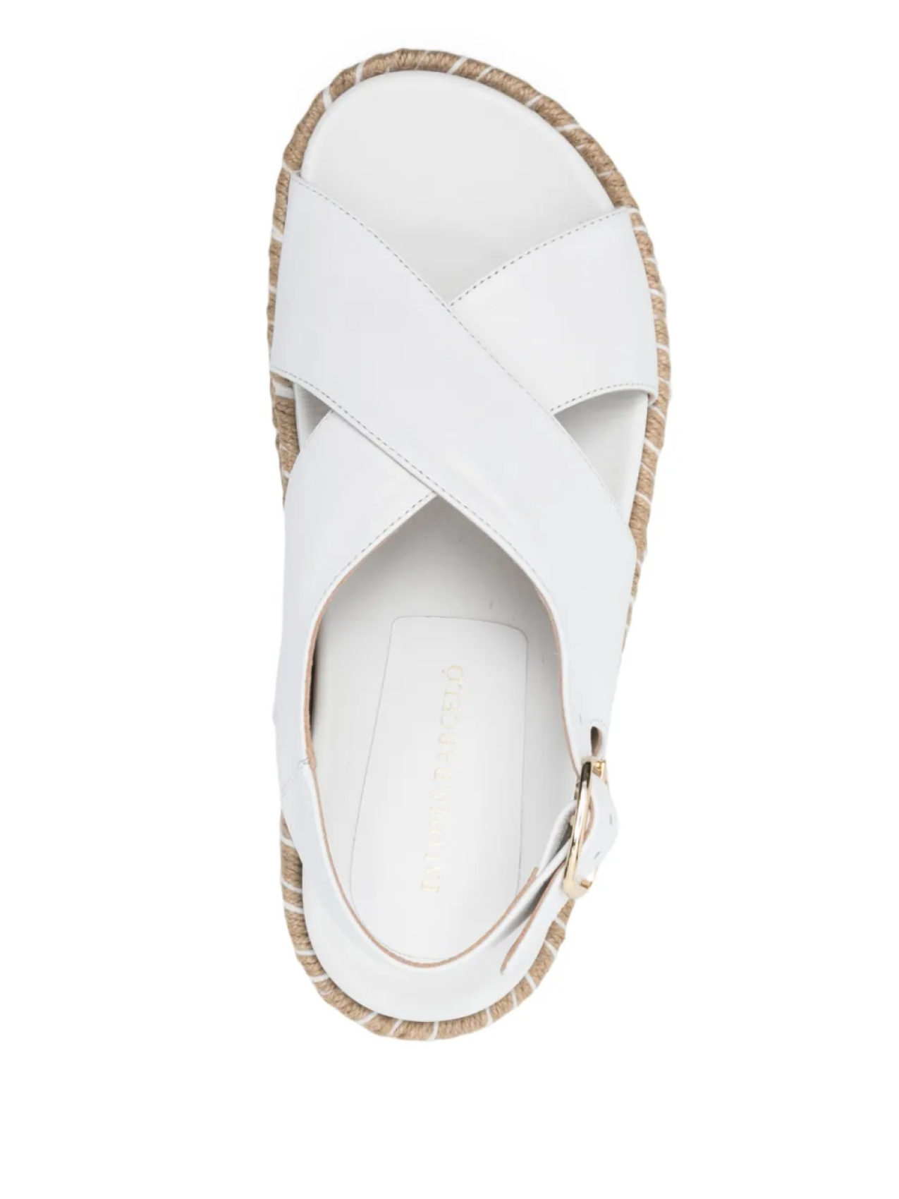 Белые туфли с застежкой на пряжке, с ремешком на пятке, с круглым открытым носком, с плетеной рафией на платформе