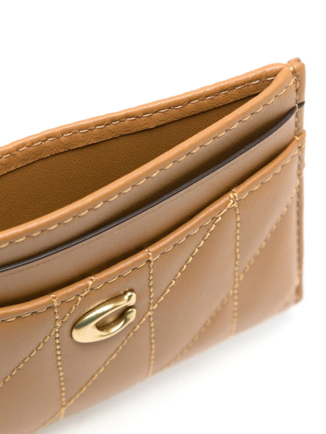 Отделения для карт цвета верблюжьей шерсти, золотистая пластина с логотипом и тональная строчка