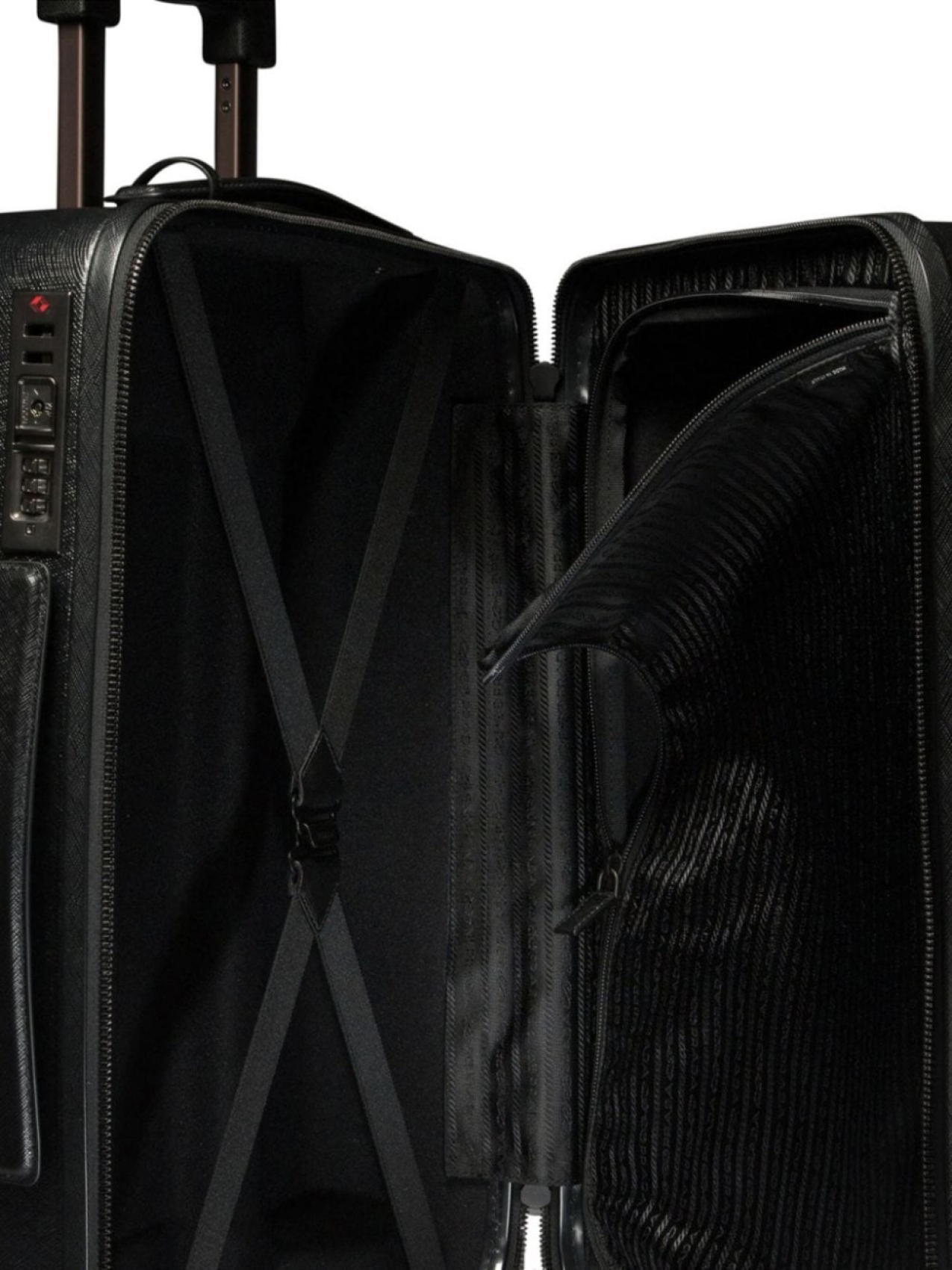 Черный кожаный треугольный логотип телескопическая ручка одинарная плоская верхняя ручка застежка-молния по всему периметру основное отделение внутренний карман на молнии внутренний эластичный ремень кодовый замок четыре колеса