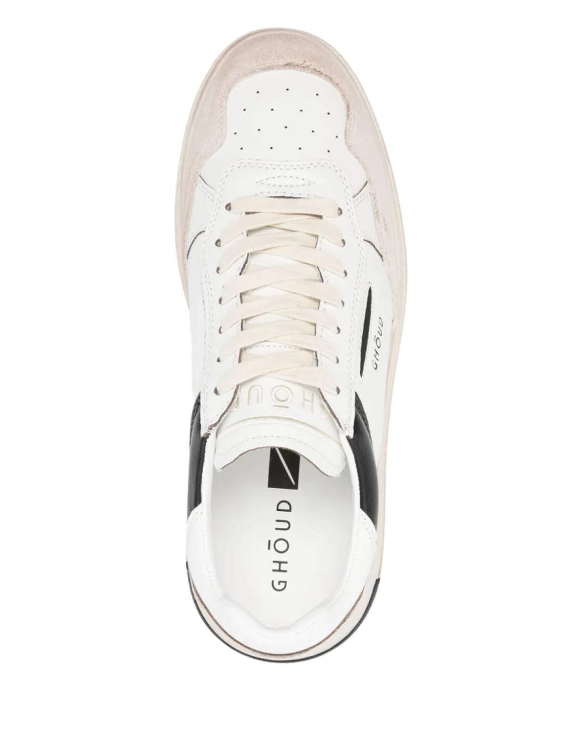 Белая шнуровка спереди, перфорированный носок, фирменная стелька с эффектом потертости