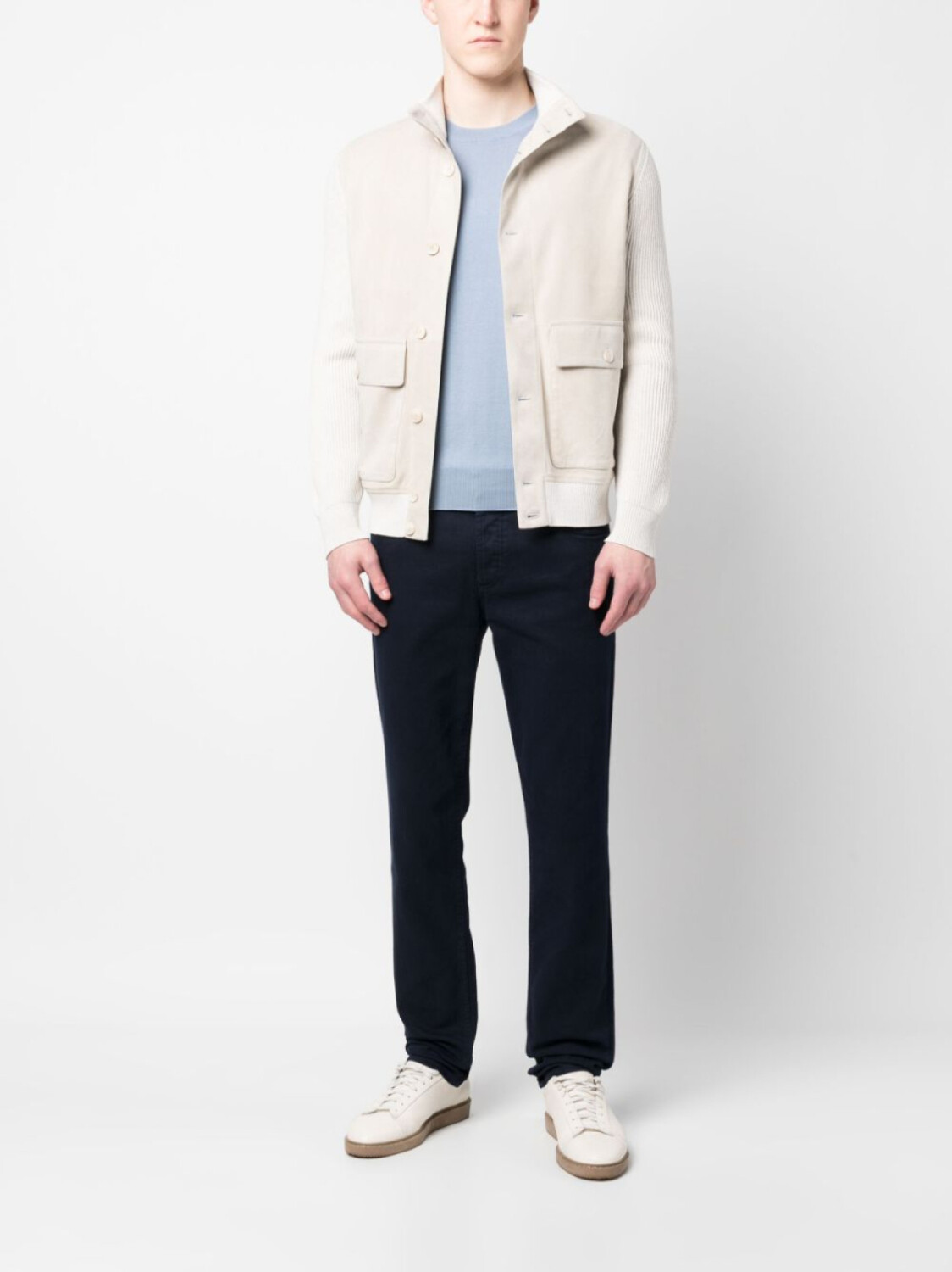 Голубой, хлопок, тонкая вязка, круглый вырез, длинные рукава и прямой подол.