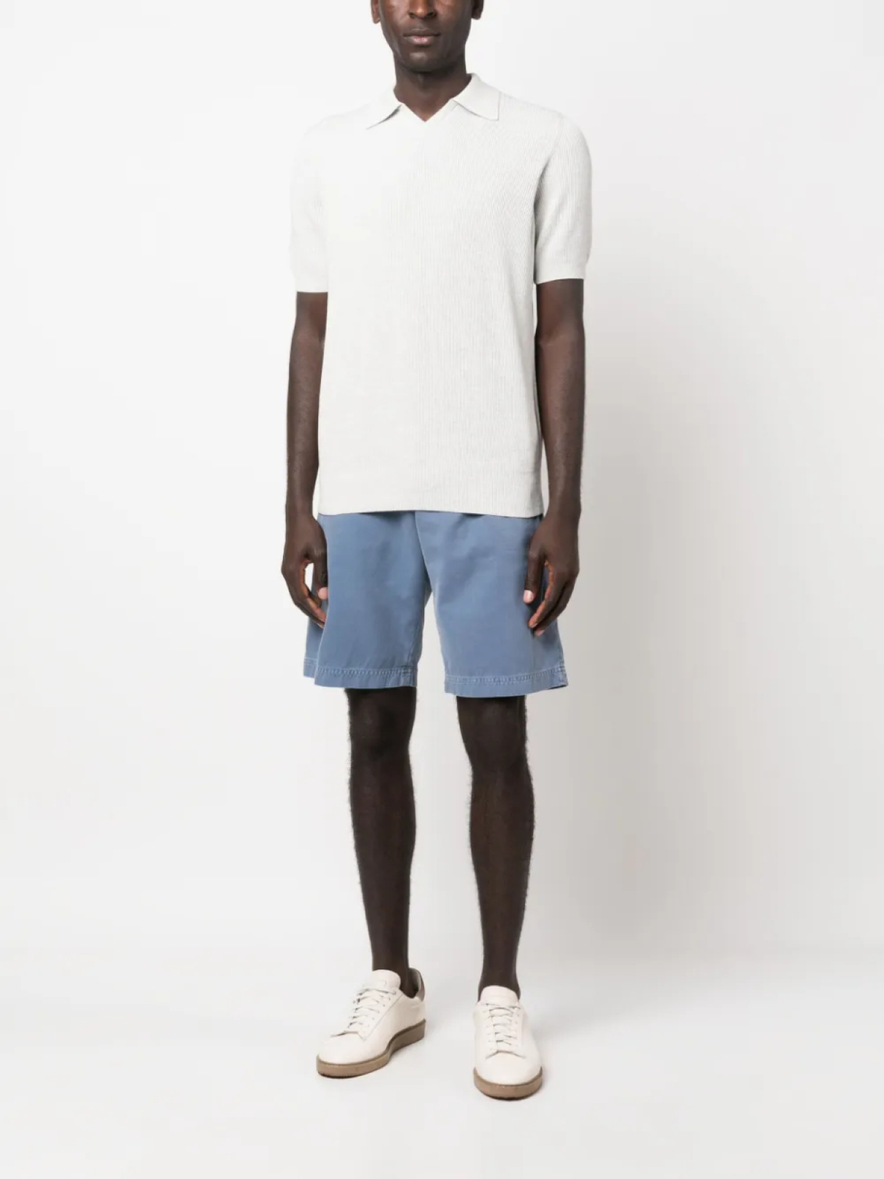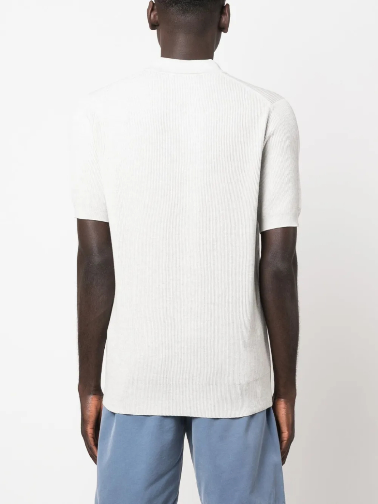 Светло-серый, хлопок, трикотаж в рубчик, воротник поло, короткие рукава и прямой подол.