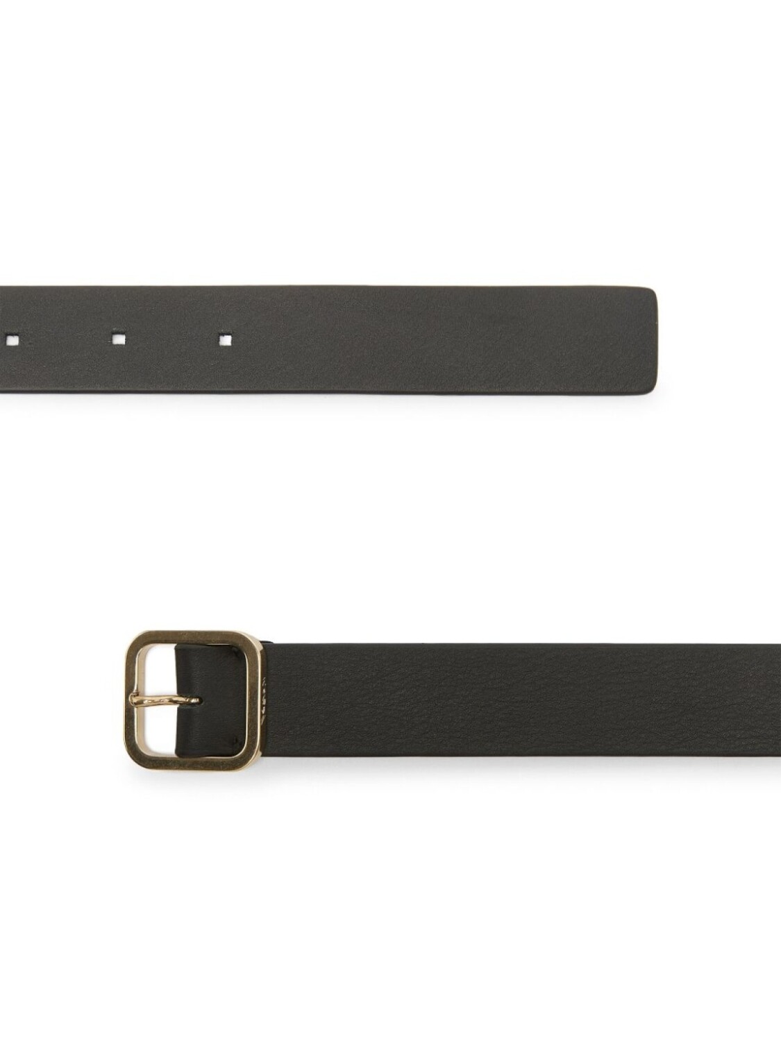 Черная пряжка, пробитые отверстия, плоский кончик, выгравированный логотип