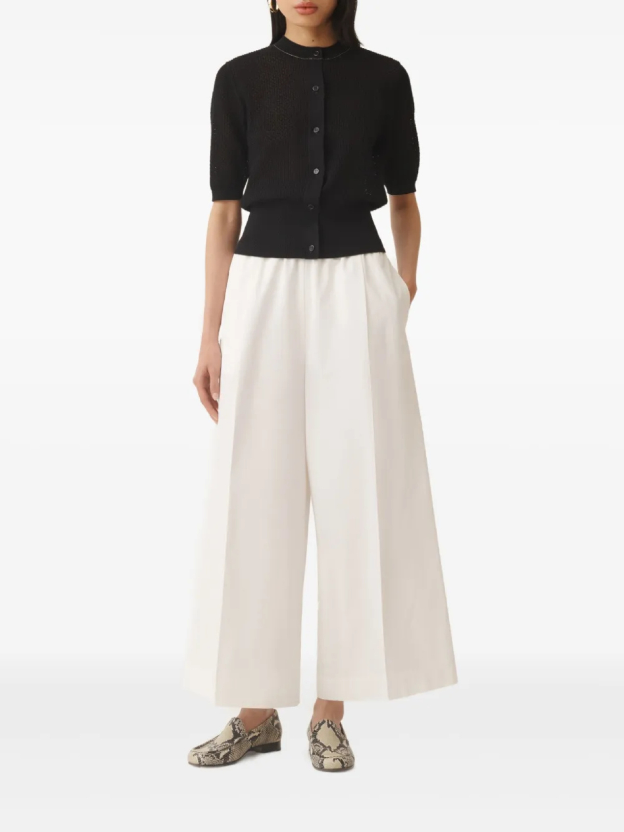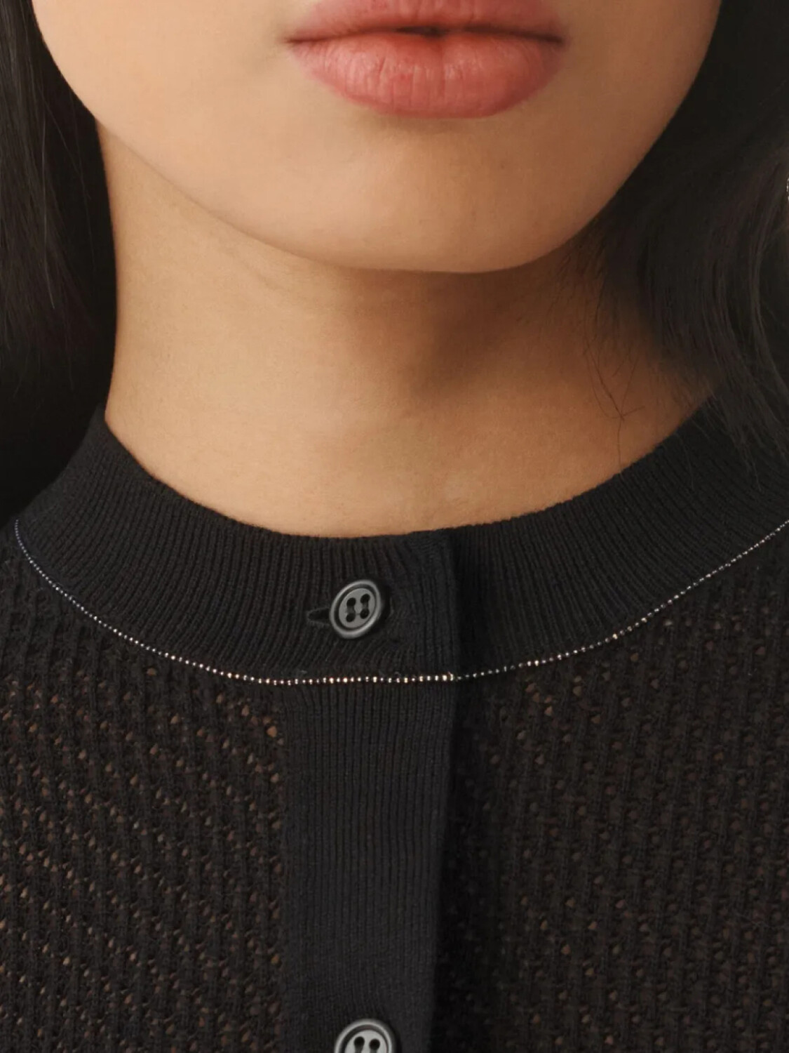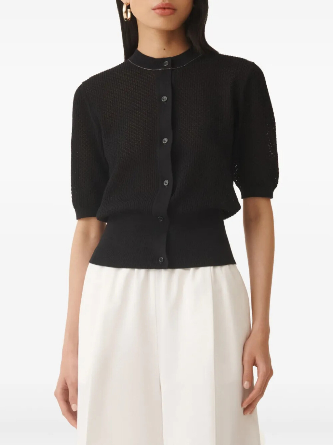Черная застежка на пуговицы спереди, ребристые манжеты и подол, короткие рукава, круглый вырез горловины