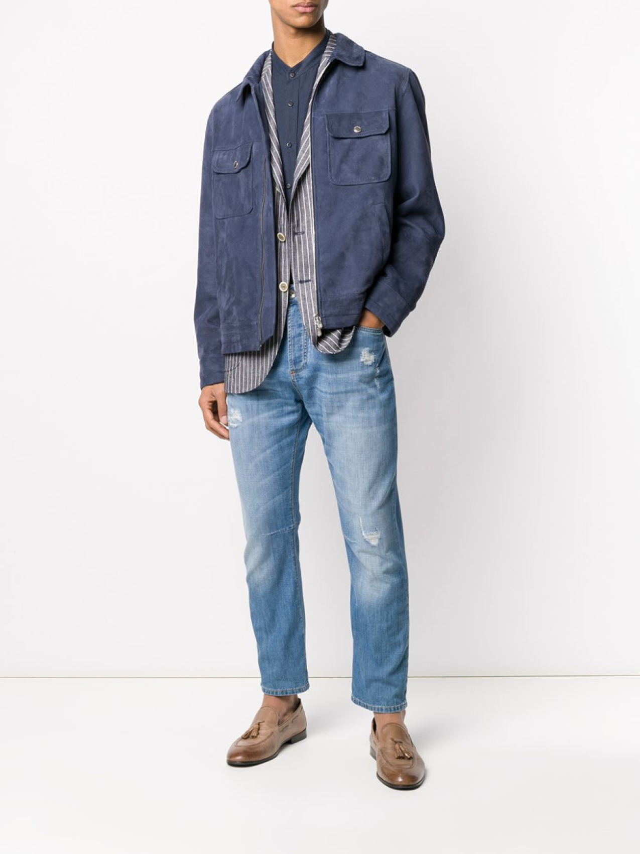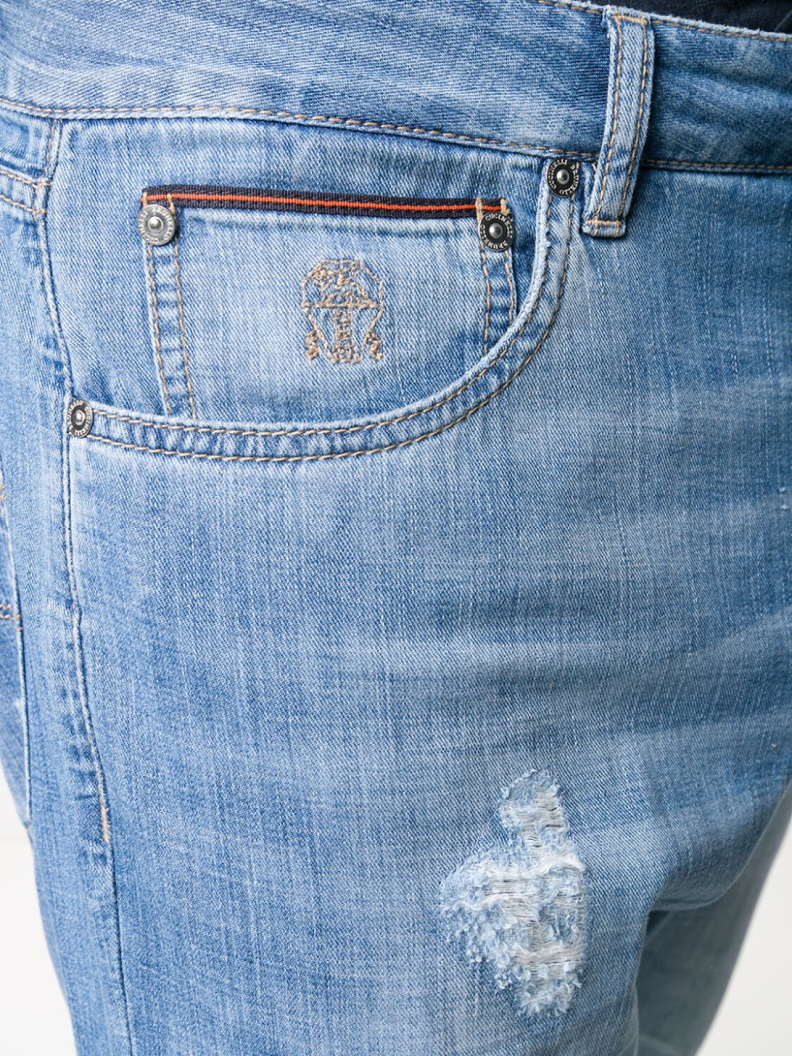 Джинсы прямого кроя с эффектом потертости от Brunello Cucinelli (Брунелло Кучинелли). Кожаная заплатка с логотипом сзади, эффект потертости, петли для ремня, ширинка на молнии с пуговицей, классическая пятикарманная модель и свободный крой.