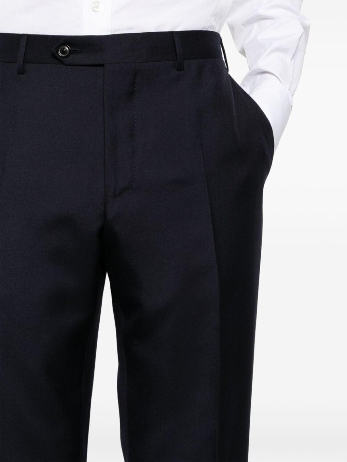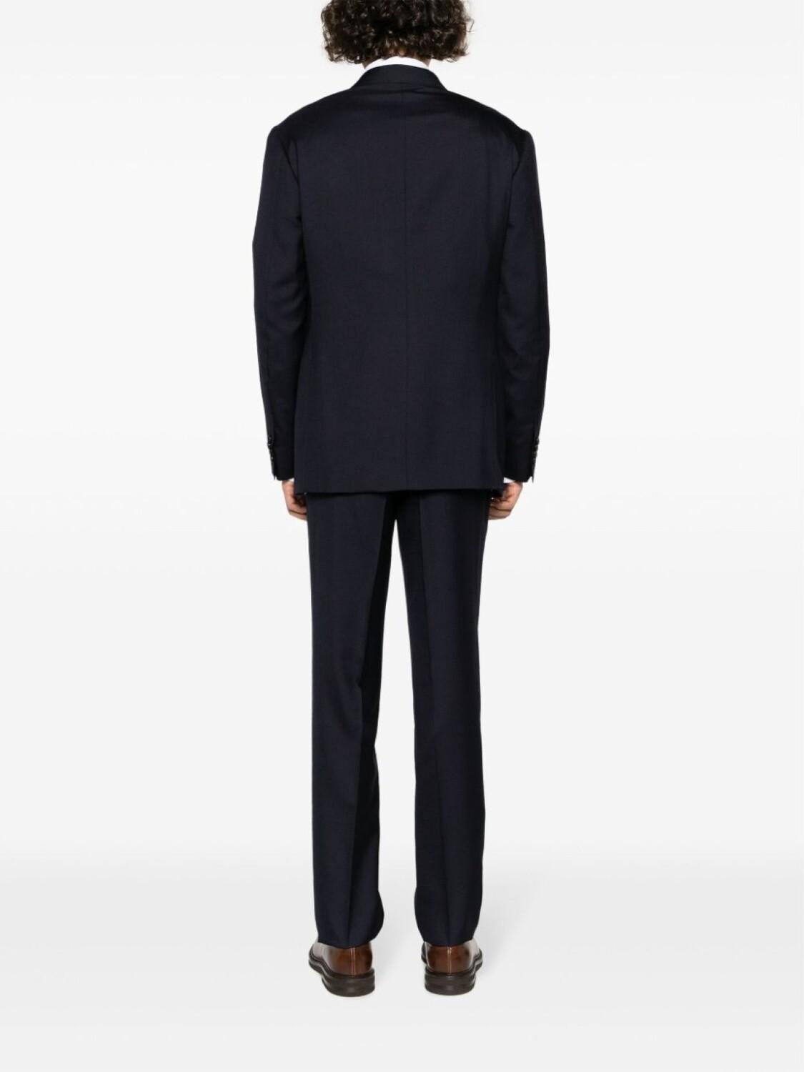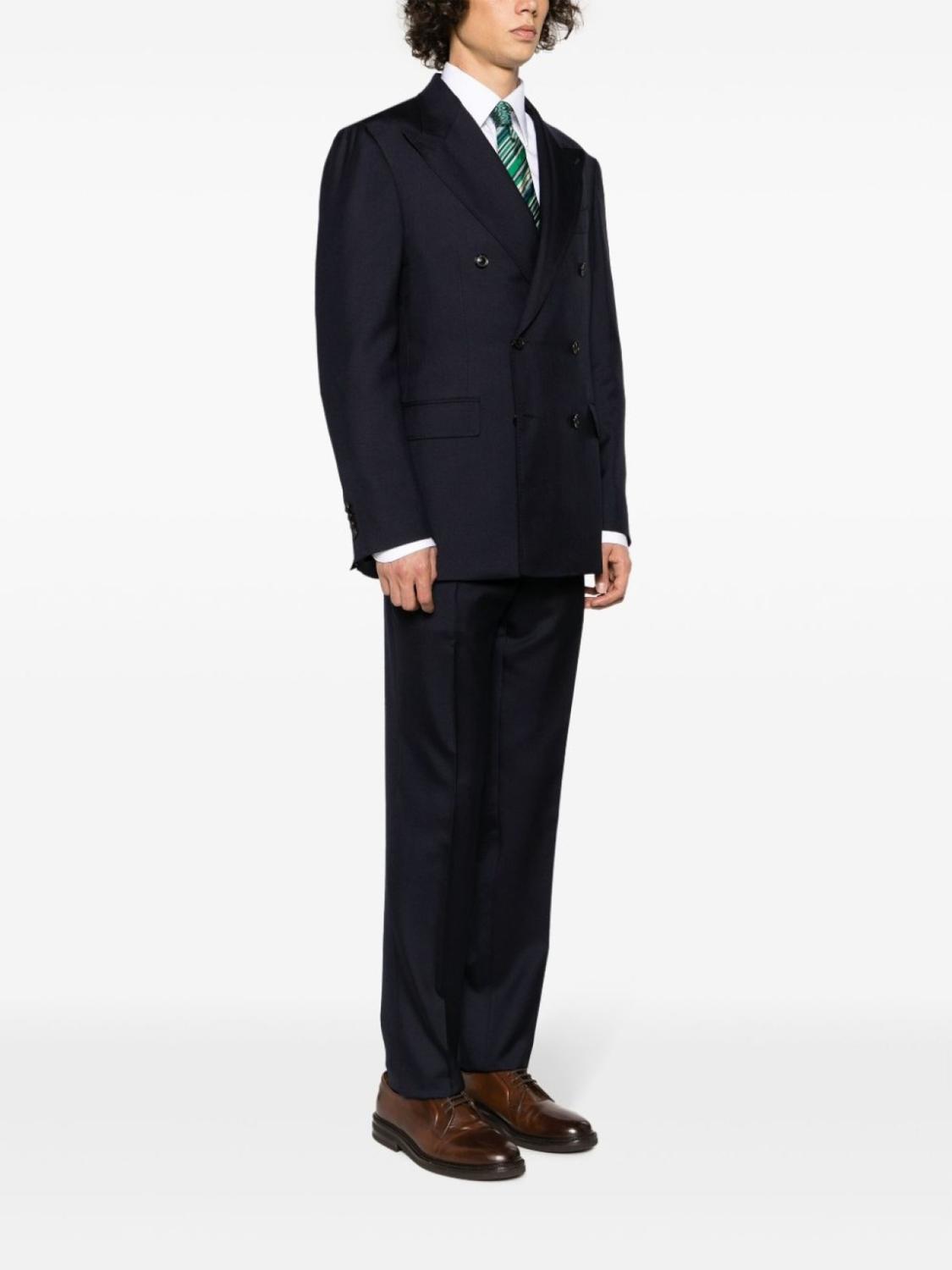 Темно-синий, смесь кашемира и шелка, заостренные лацканы, двубортная застежка на кнопки, длинные рукава, два передних кармана с клапанами, петли для ремня, стрелки, прямой крой, смещенная застежка на пуговицах спереди и два прорезных кармана по бокам.