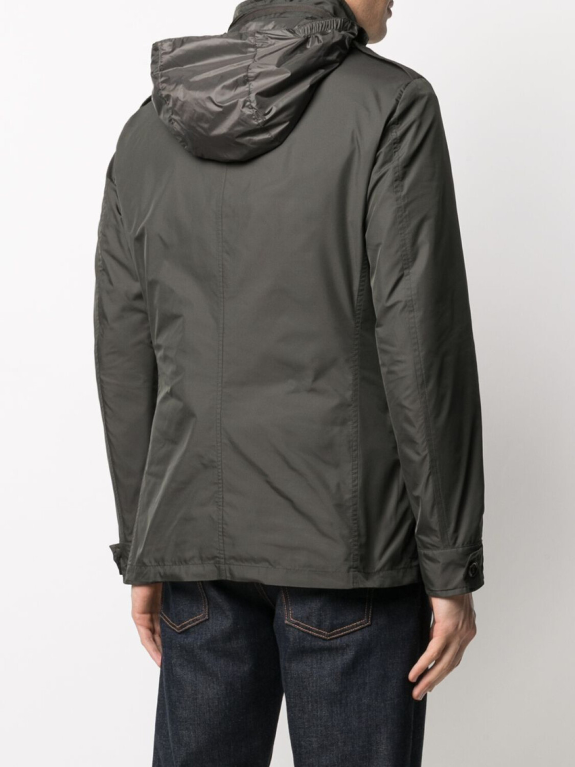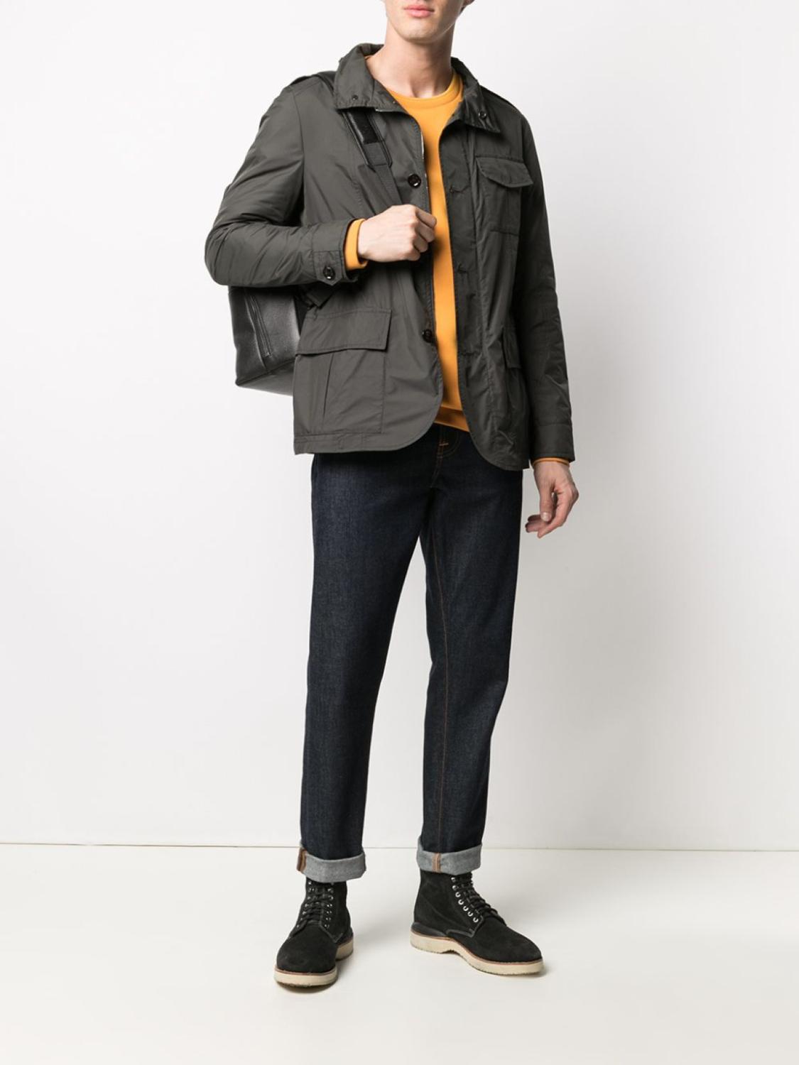 Высокий воротник, застежка на пуговицах спереди, длинные рукава и передние карманы с клапаном.