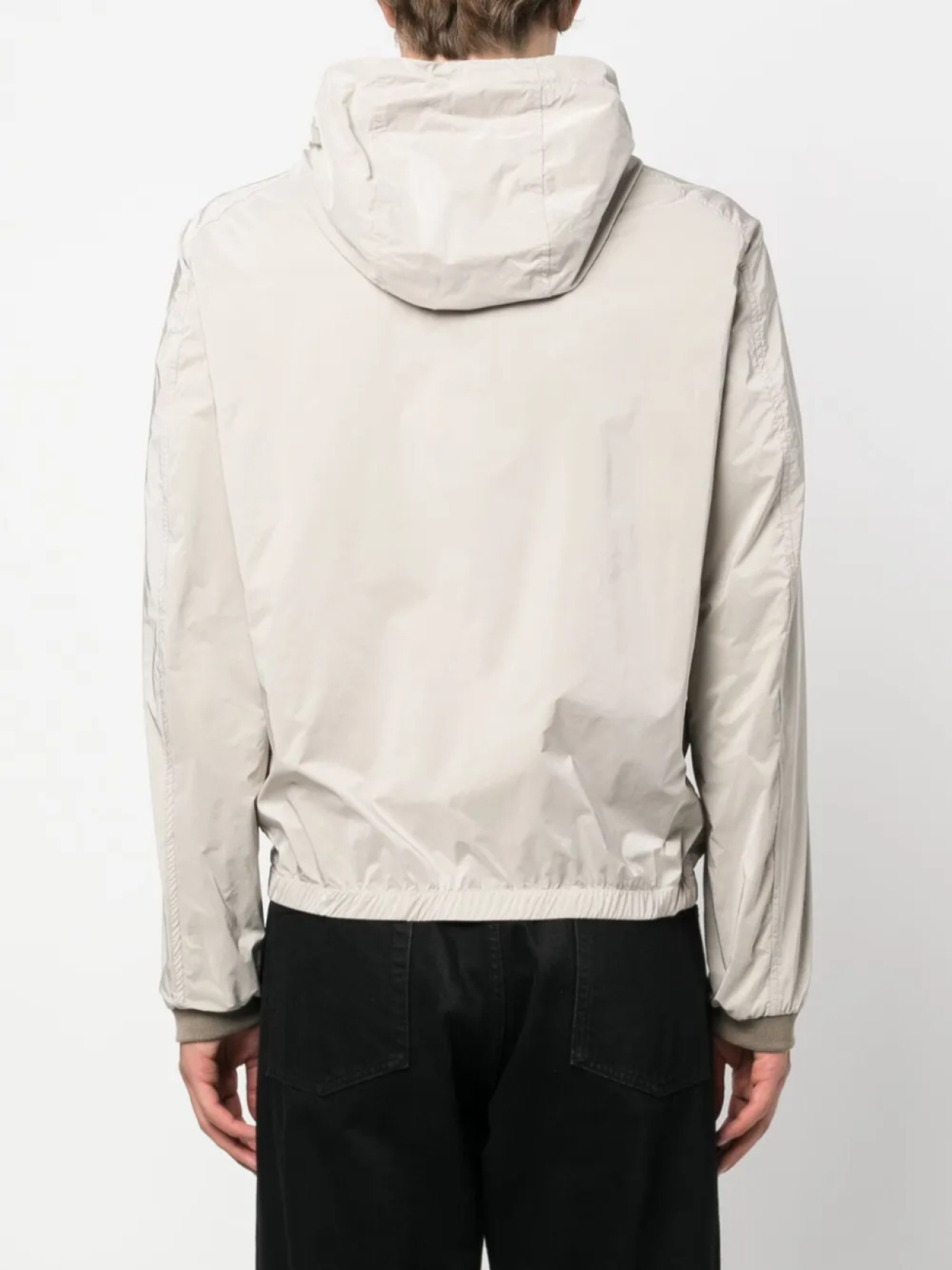 Кремовый, маленькая подвеска с логотипом, затягивающийся на шнурок капюшон, двусторонняя молния спереди, два прорезных кармана сбоку, длинные рукава, эластичные манжеты, эластичный подол и прямой подол.