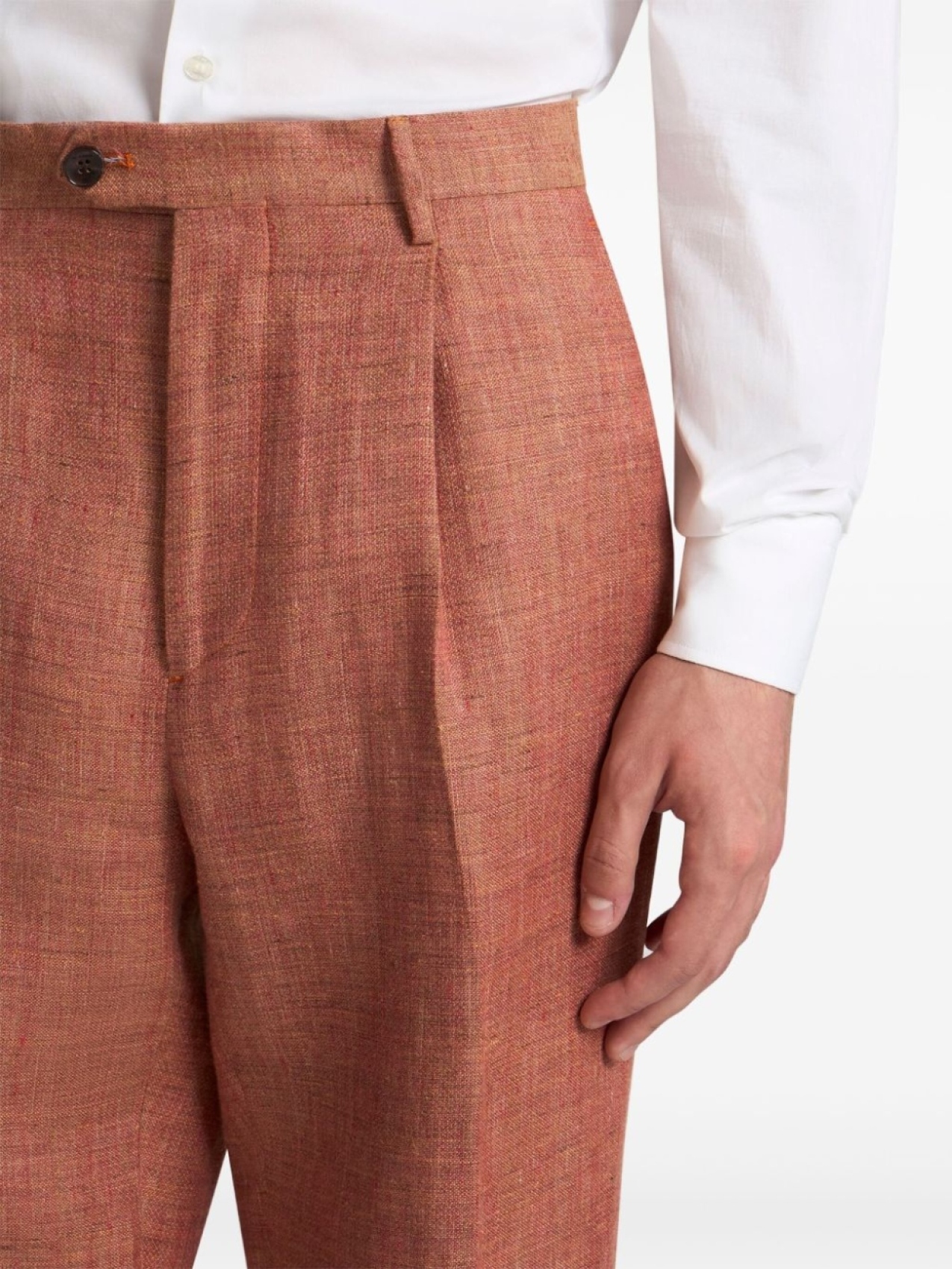Терракотово-оранжевый, застежка на пуговицы спереди, два прорезных кармана по бокам, два прорезных кармана сзади, застегивающиеся на пуговицы