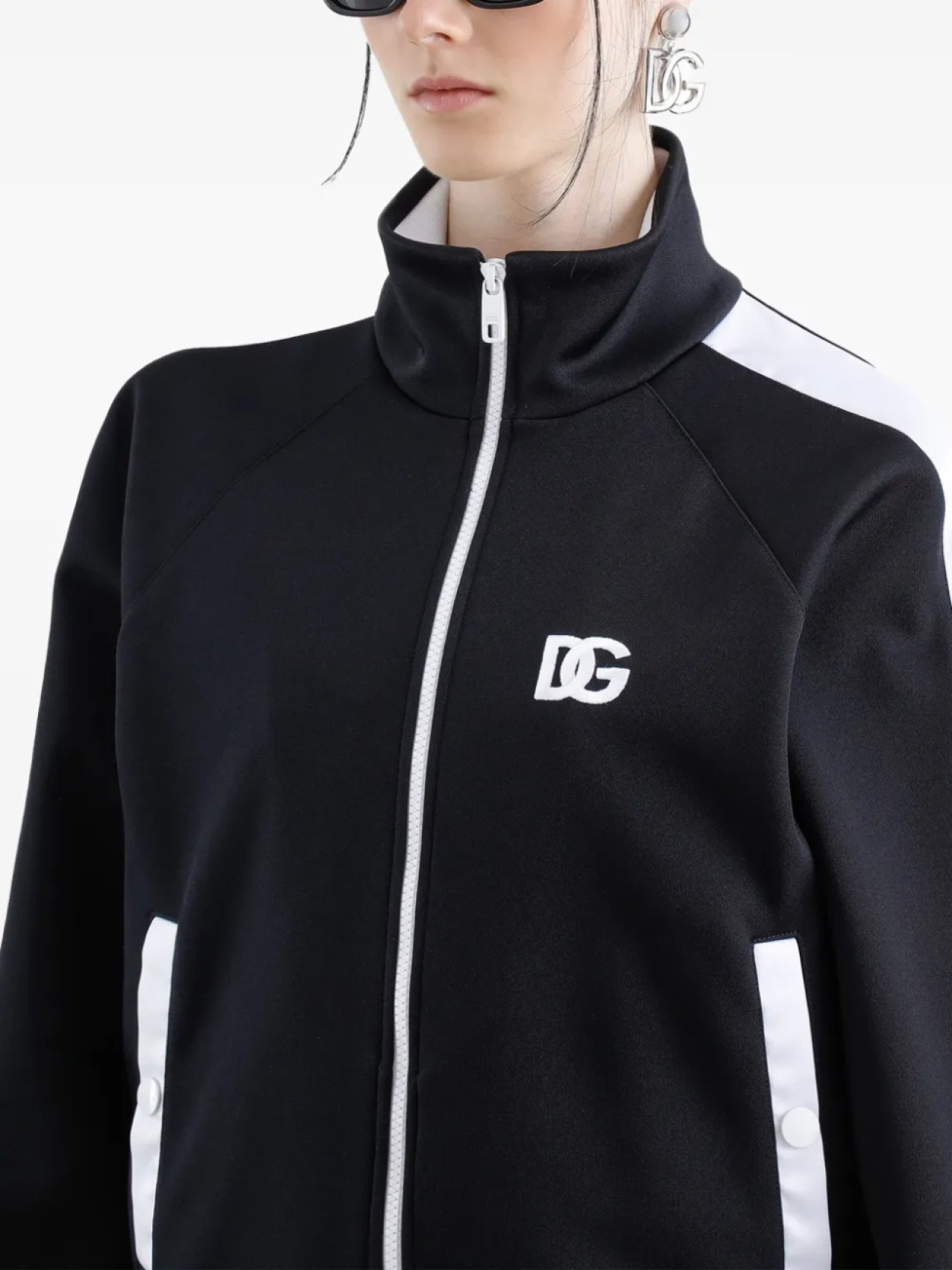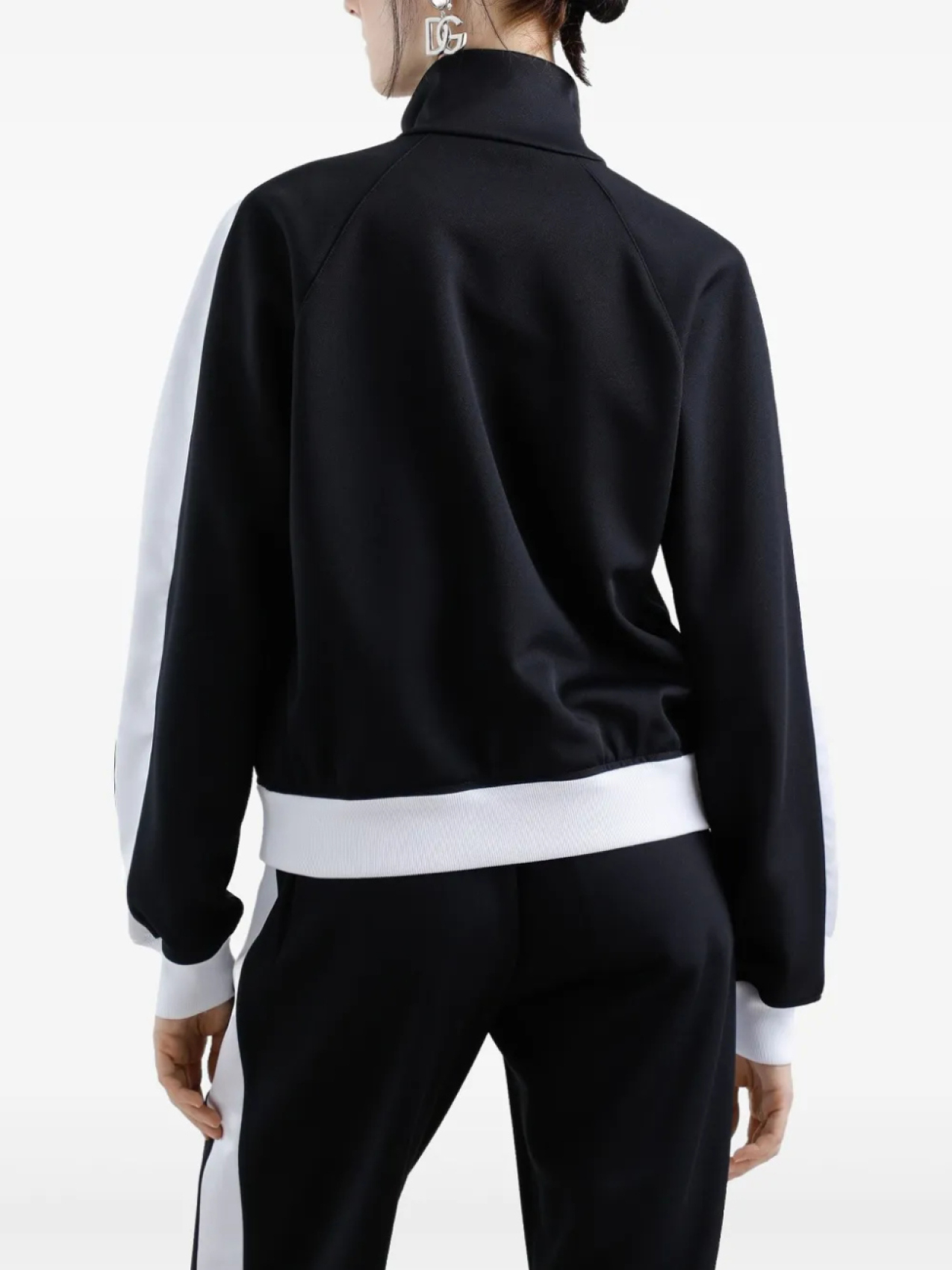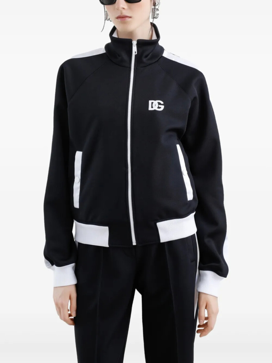 Черная застежка-молния спереди, ребристые манжеты и полоски по бокам на подоле, высокий воротник